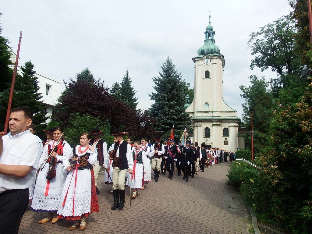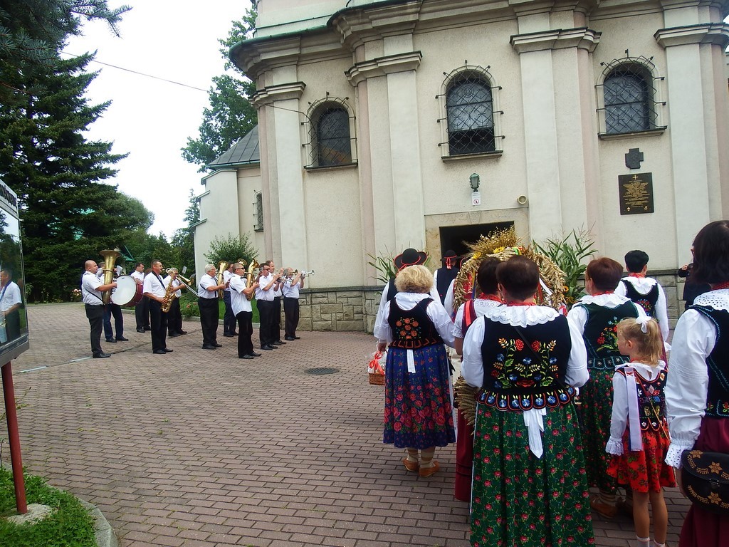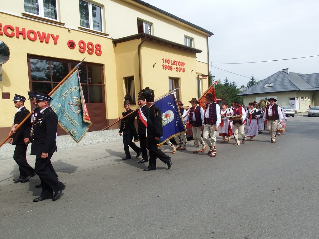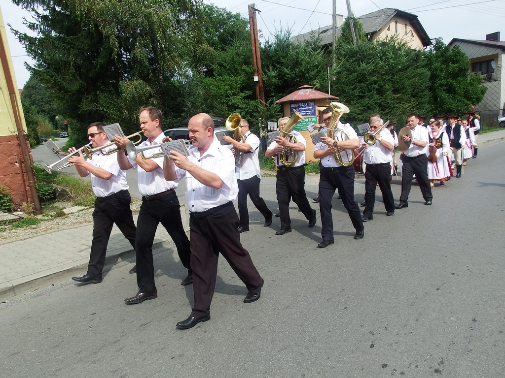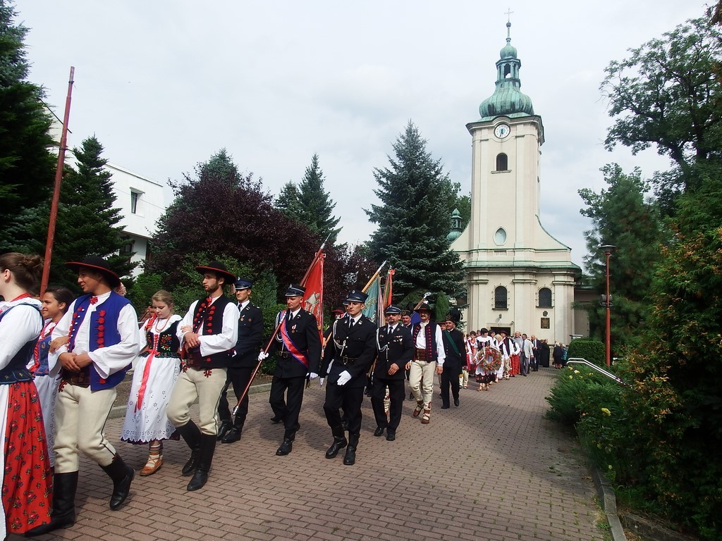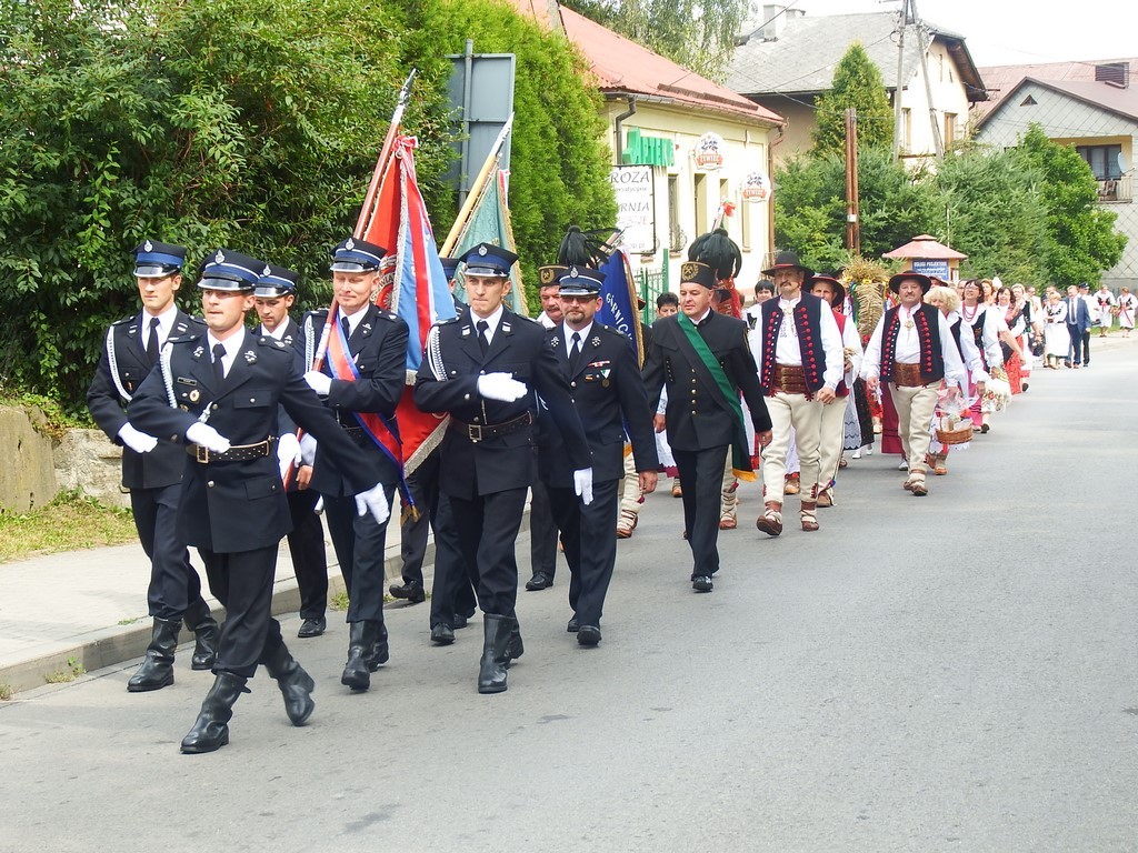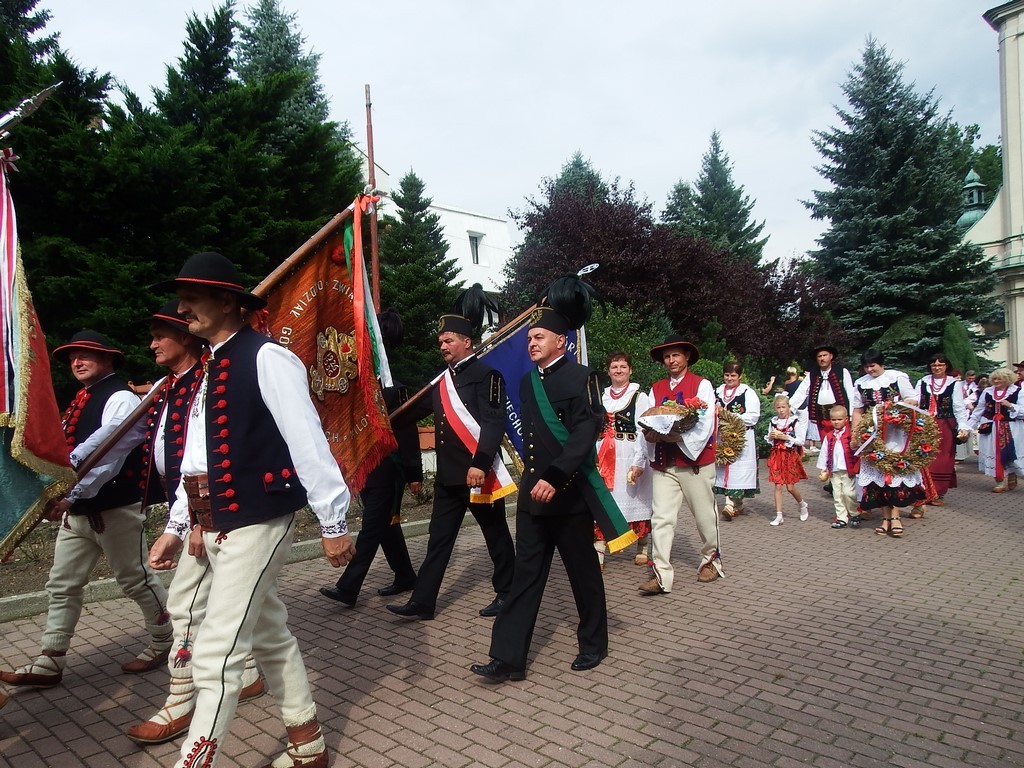 Dożynkowy korowód w marszowych rytmach prowadziła do kościoła Orkiestra Dęta OSP Radziechowy, przy udziale pocztów sztandarowych OSP z Radziechów i Przybędzy oraz Związku Podhalan, przedstawicieli Zespołu Pieśni i Tańca „GROJCOWIANIE”, „JODEŁEK”, delegacji Kół Gospodyń z całej gminy, zaproszonych gości, radnych, sołtysów, sponsorów, i mieszkańców Radziechów. Wszyscy w dożynkowej scenerii, uczestniczyli w uroczystej Mszy Św., którą wraz z Ks. Proboszczem Piotrem Pokojnikowem, celebrowało 5 księży.
