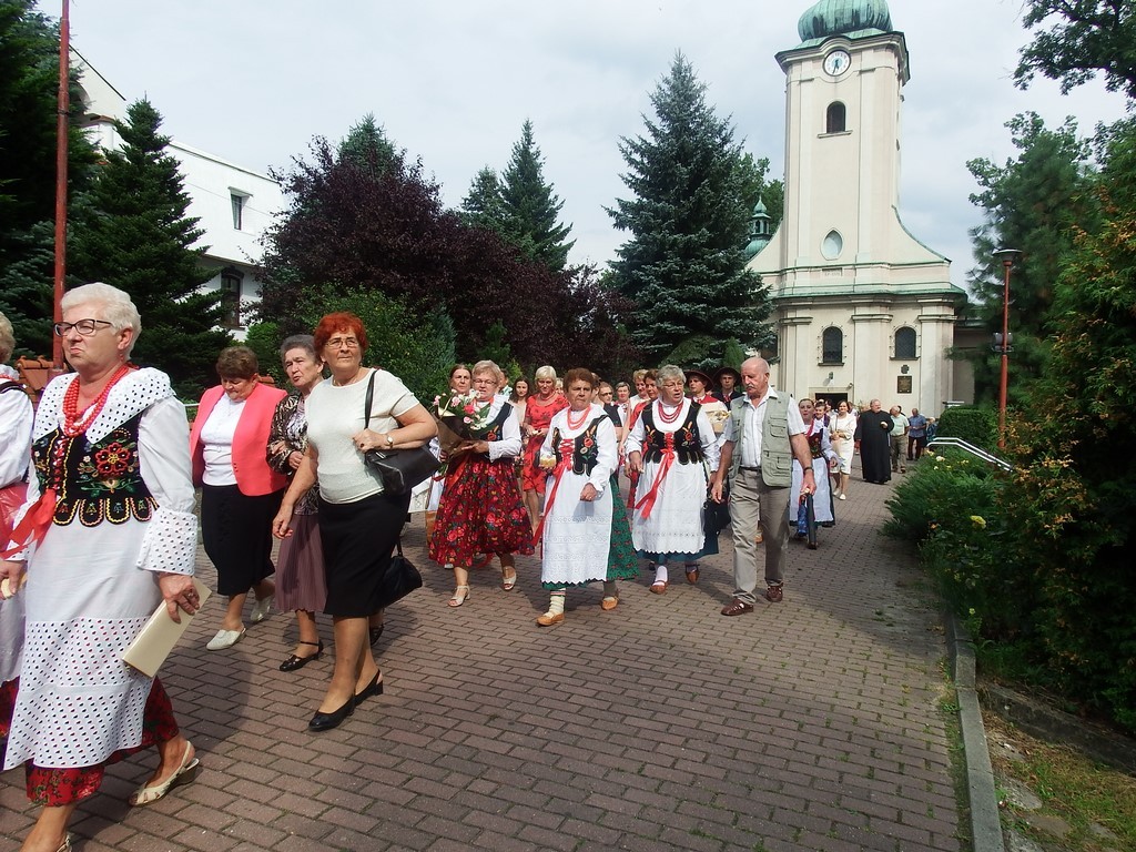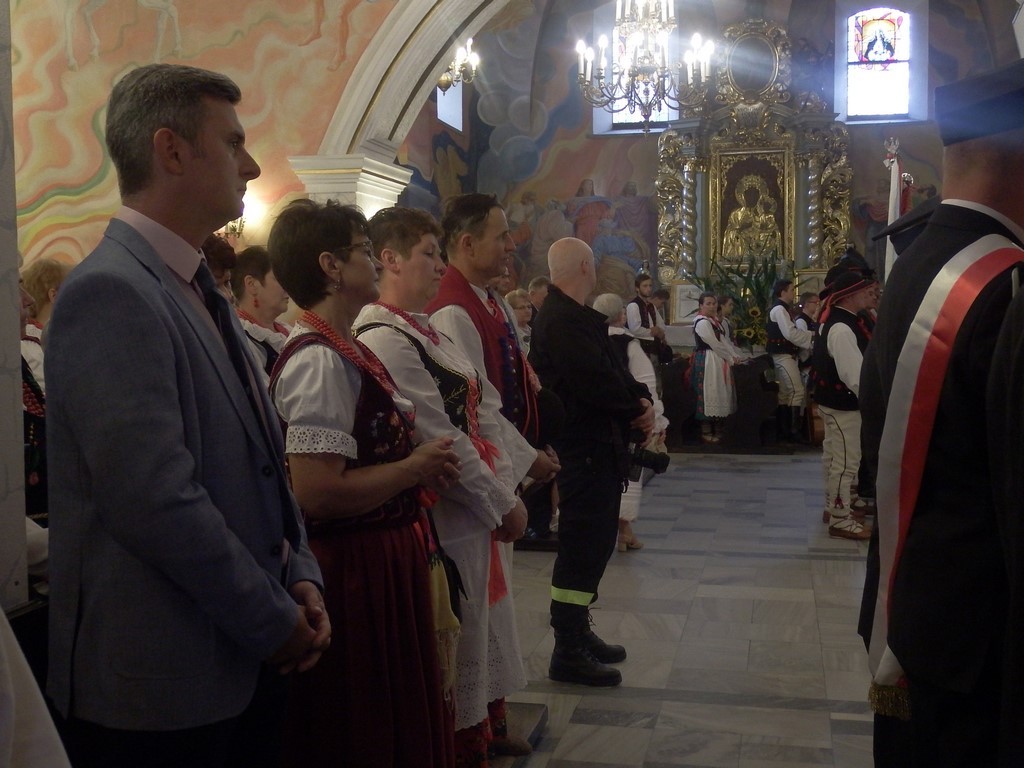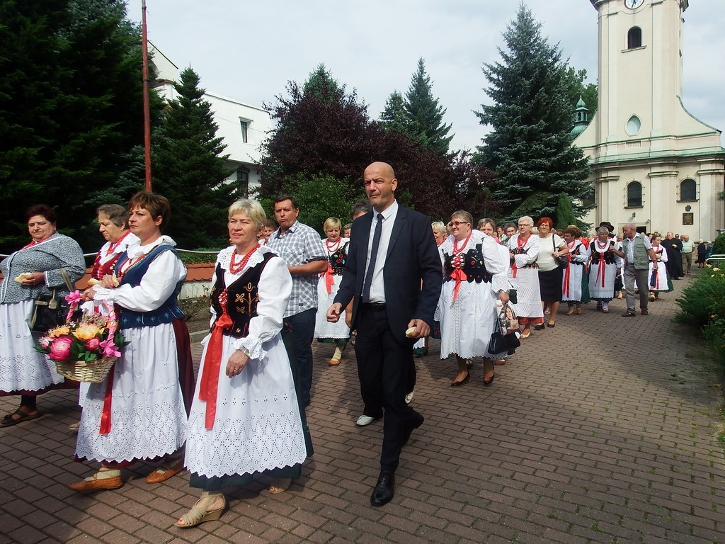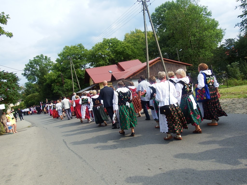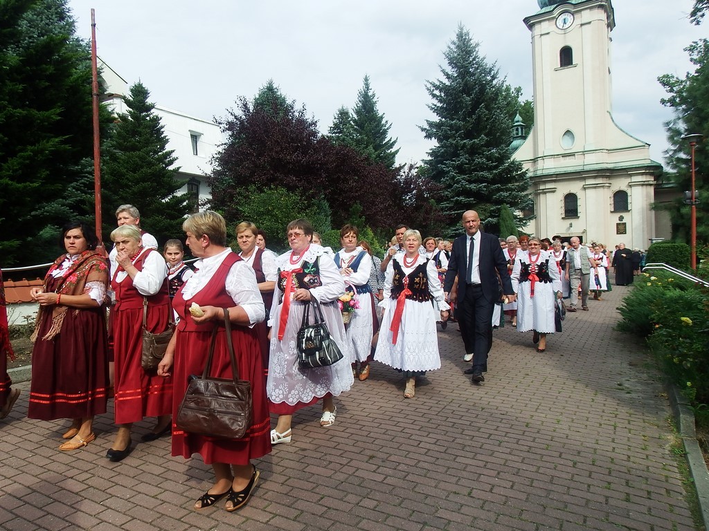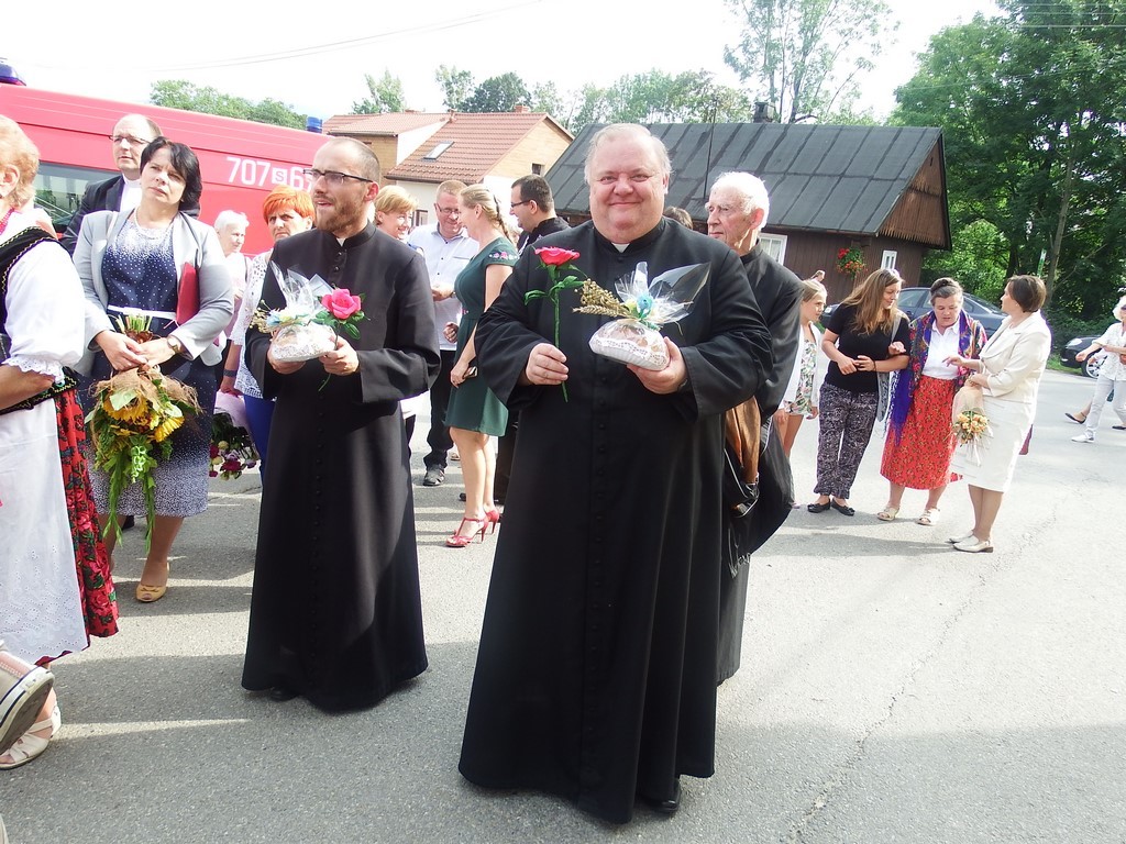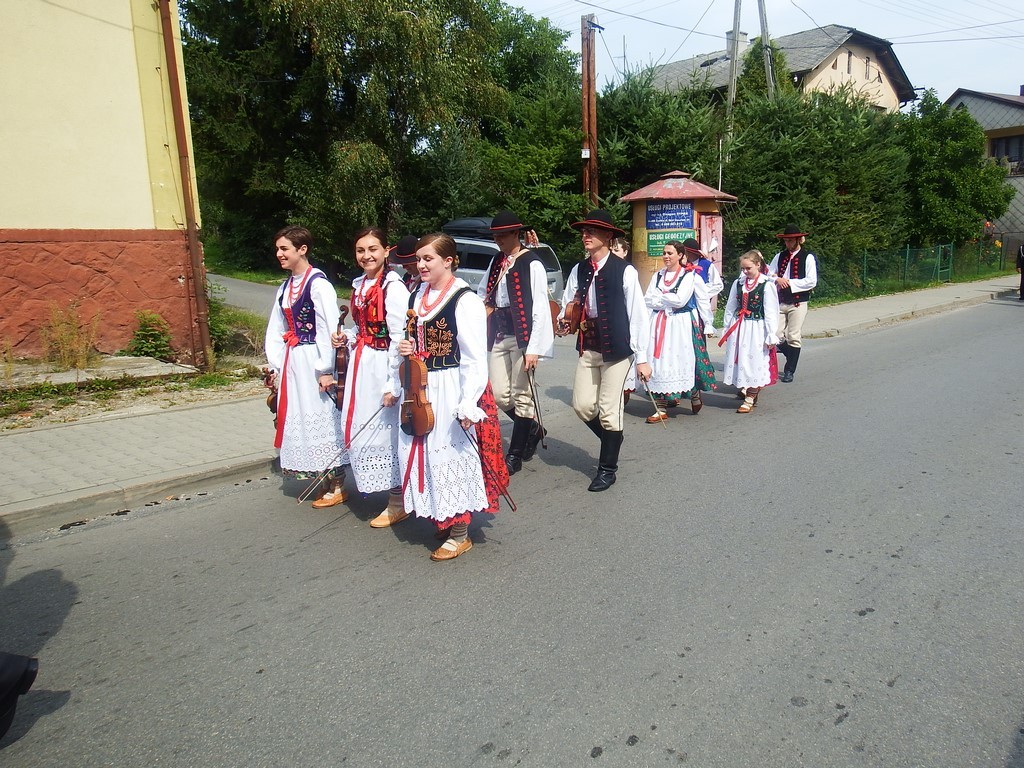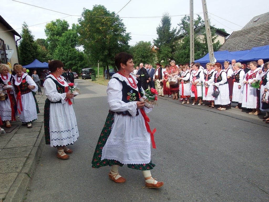 Dożynkowy korowód w marszowych rytmach prowadziła do kościoła Orkiestra Dęta OSP Radziechowy, przy udziale pocztów sztandarowych OSP z Radziechów i Przybędzy oraz Związku Podhalan, przedstawicieli Zespołu Pieśni i Tańca „GROJCOWIANIE”, „JODEŁEK”, delegacji Kół Gospodyń z całej gminy, zaproszonych gości, radnych, sołtysów, sponsorów, i mieszkańców Radziechów. Wszyscy w dożynkowej scenerii, uczestniczyli w uroczystej Mszy Św., którą wraz z Ks. Proboszczem Piotrem Pokojnikowem, celebrowało 5 księży.