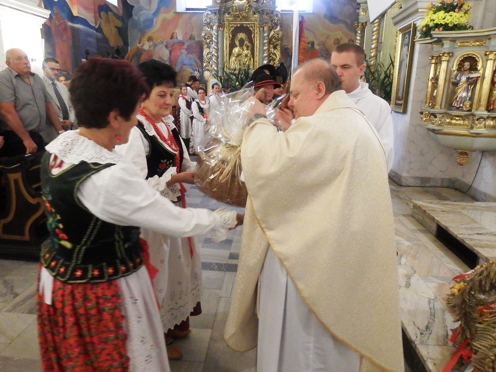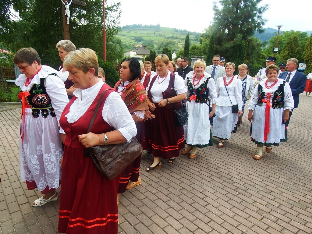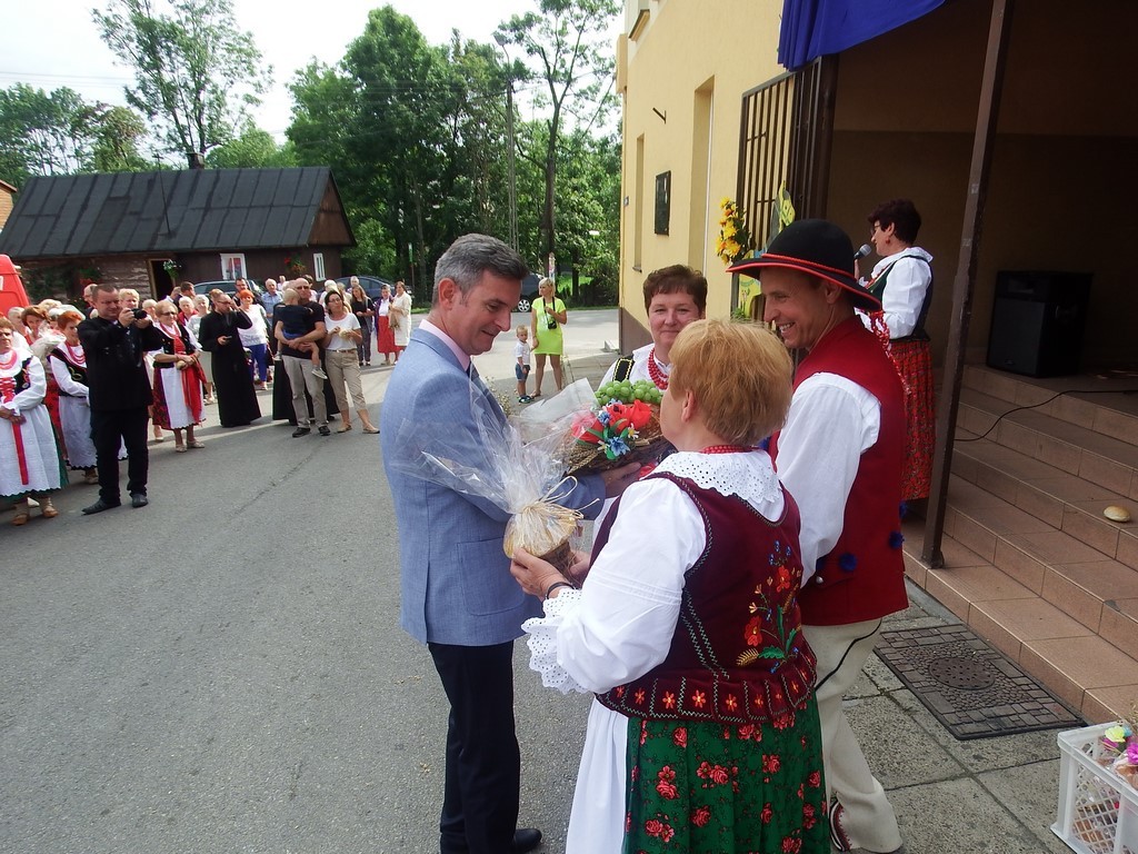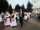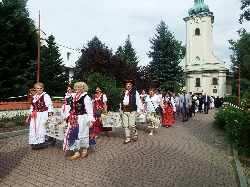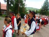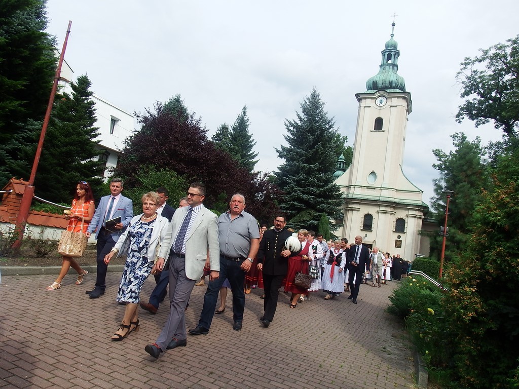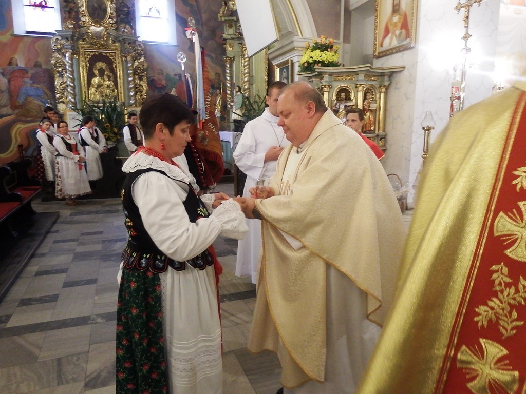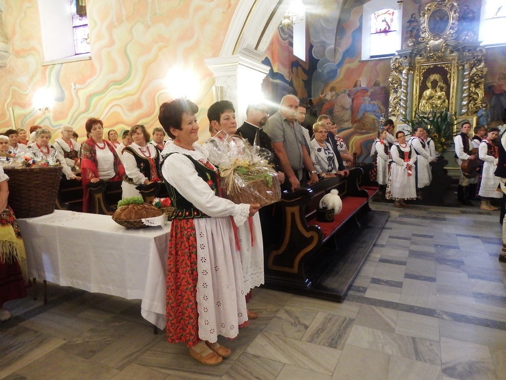 Dożynkowy korowód w marszowych rytmach prowadziła do kościoła Orkiestra Dęta OSP Radziechowy, przy udziale pocztów sztandarowych OSP z Radziechów i Przybędzy oraz Związku Podhalan, przedstawicieli Zespołu Pieśni i Tańca „GROJCOWIANIE”, „JODEŁEK”, delegacji Kół Gospodyń z całej gminy, zaproszonych gości, radnych, sołtysów, sponsorów, i mieszkańców Radziechów. Wszyscy w dożynkowej scenerii, uczestniczyli w uroczystej Mszy Św., którą wraz z Ks. Proboszczem Piotrem Pokojnikowem, celebrowało 5 księży.
