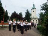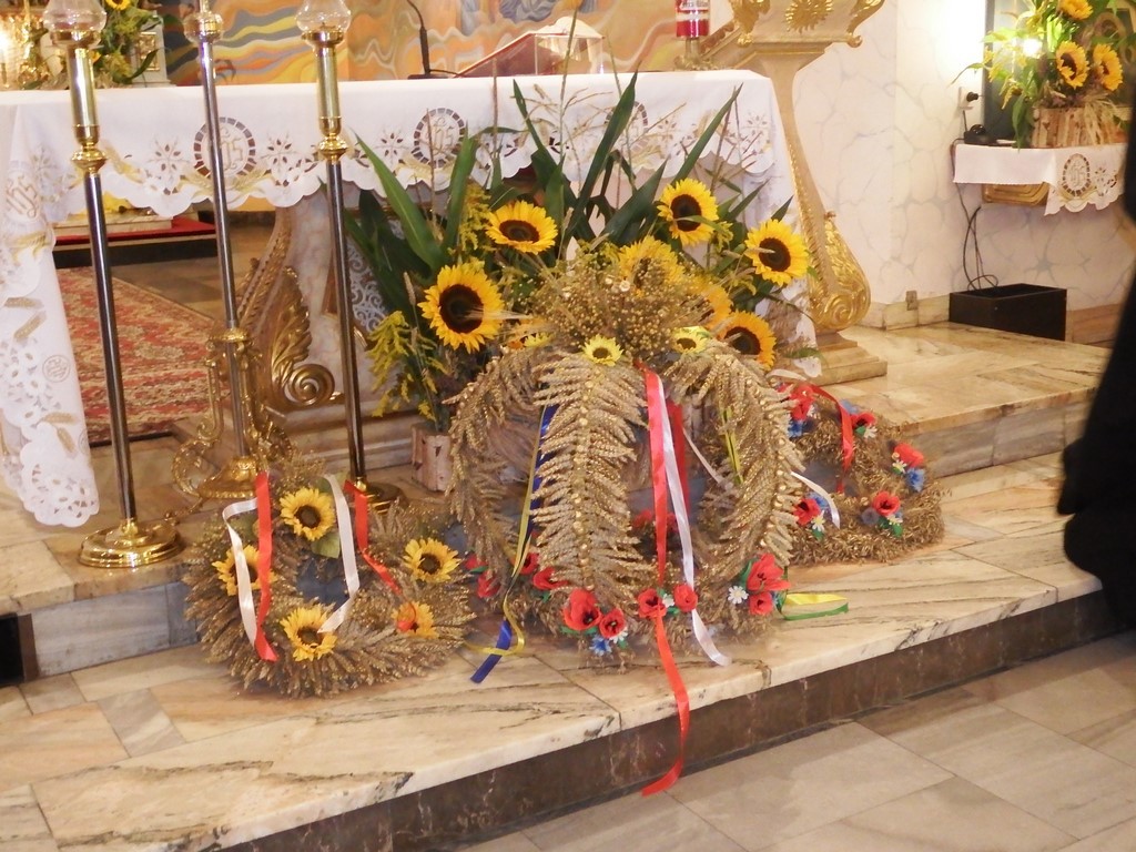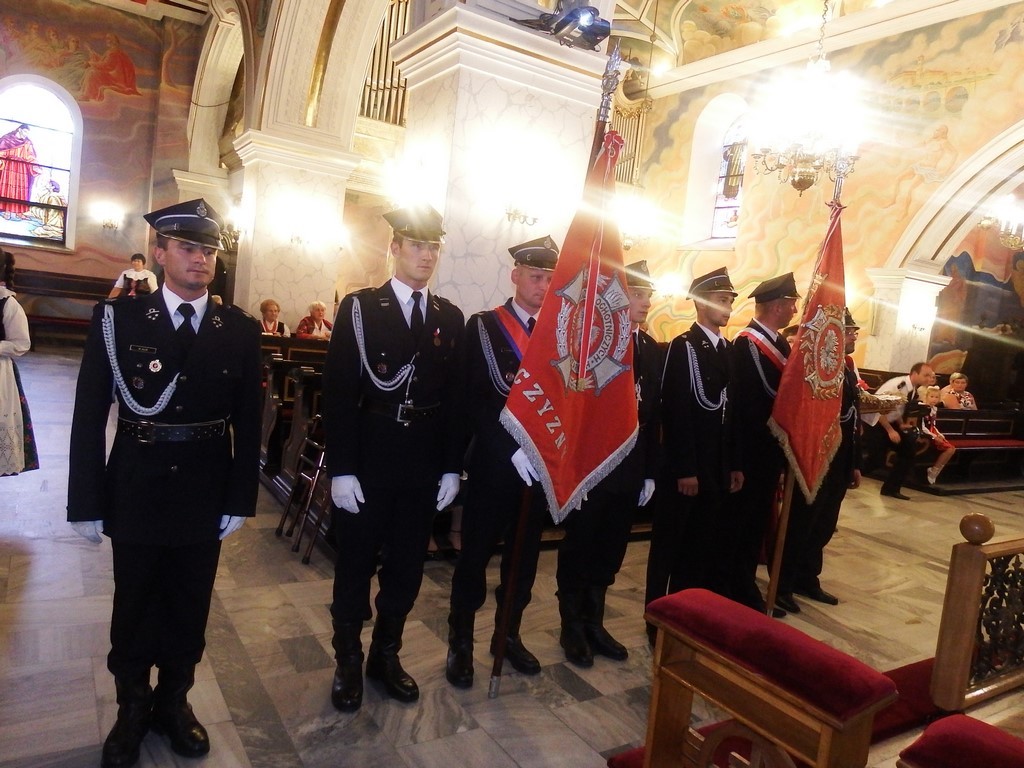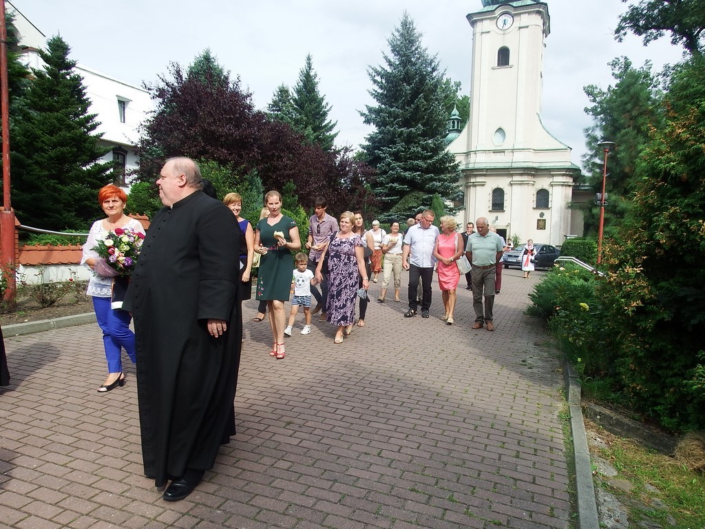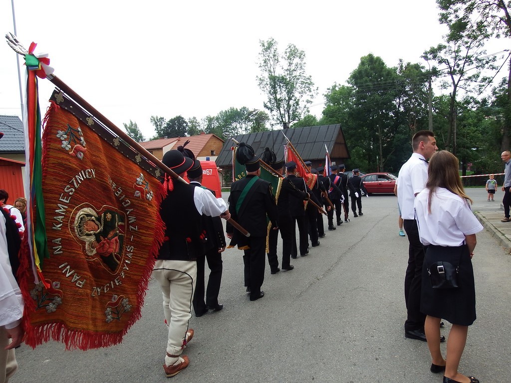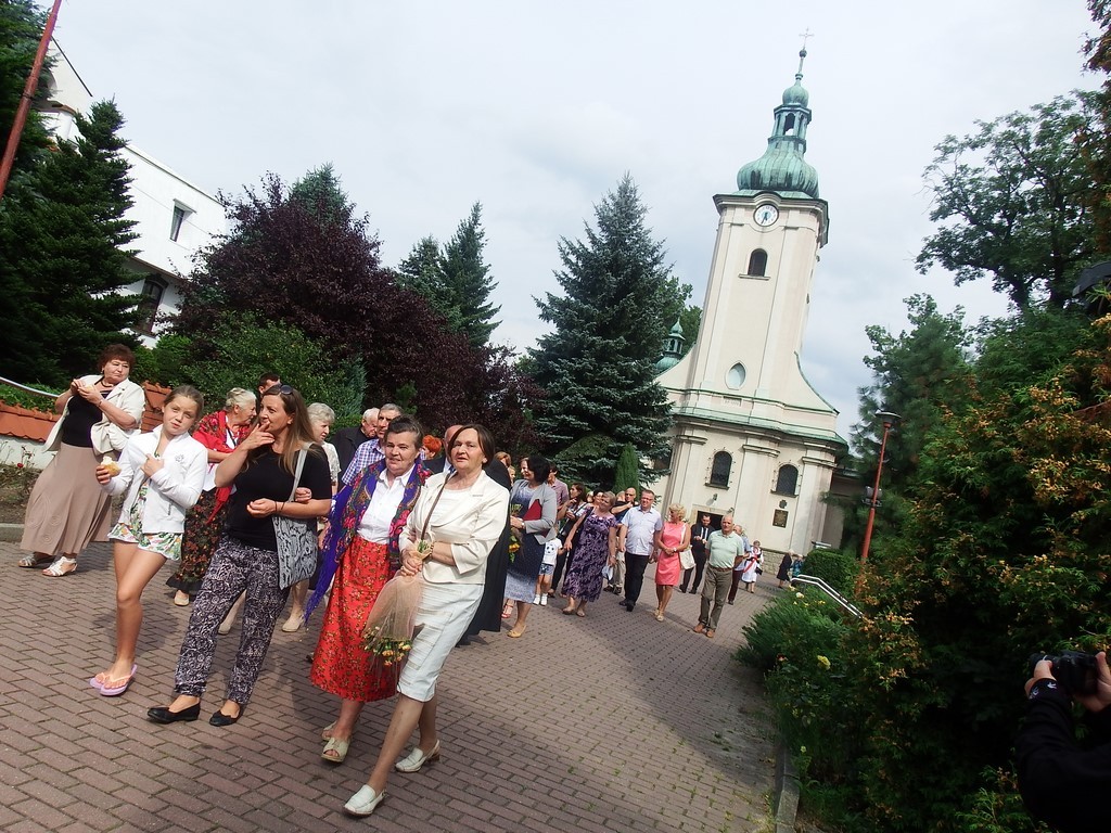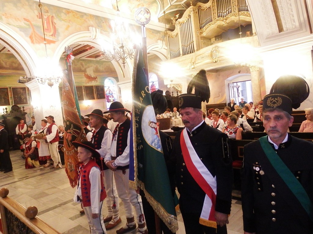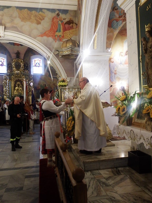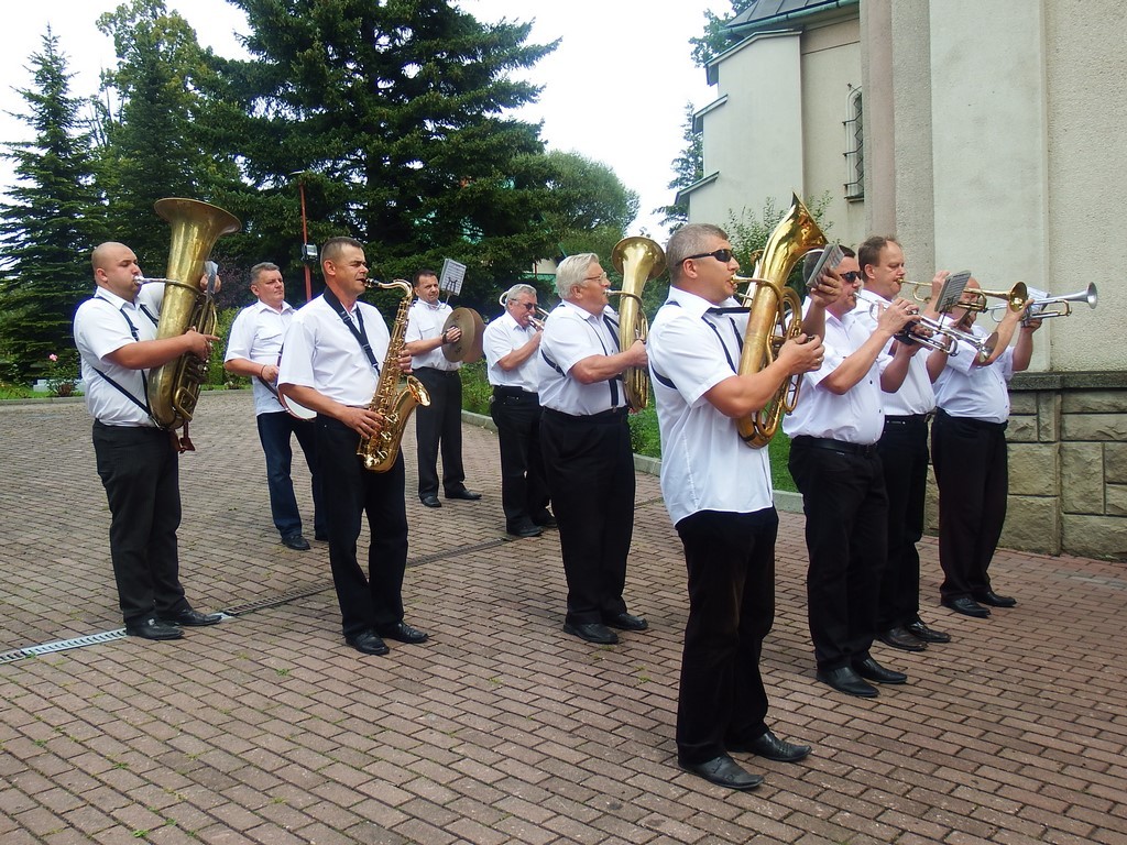 Dożynkowy korowód w marszowych rytmach prowadziła do kościoła Orkiestra Dęta OSP Radziechowy, przy udziale pocztów sztandarowych OSP z Radziechów i Przybędzy oraz Związku Podhalan, przedstawicieli Zespołu Pieśni i Tańca „GROJCOWIANIE”, „JODEŁEK”, delegacji Kół Gospodyń z całej gminy, zaproszonych gości, radnych, sołtysów, sponsorów, i mieszkańców Radziechów. Wszyscy w dożynkowej scenerii, uczestniczyli w uroczystej Mszy Św., którą wraz z Ks. Proboszczem Piotrem Pokojnikowem, celebrowało 5 księży.