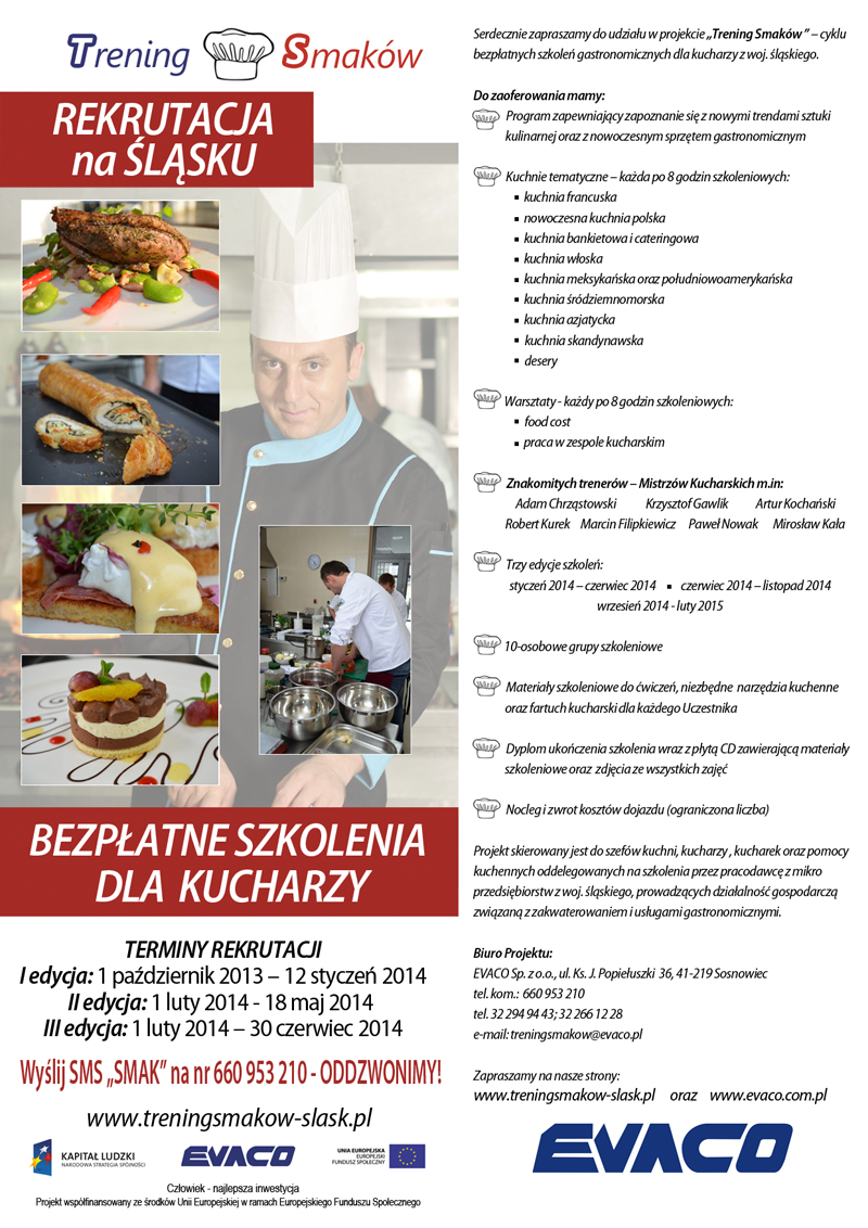 Firma EVACO Sp. z o. o. działająca od ponad 22 lat w branży gastronomicznej przygotowała cykl szkoleń gastronomicznych w ramach projektu „Trening Smaków” współfinansowanego z Europejskiego Funduszu Społecznego.