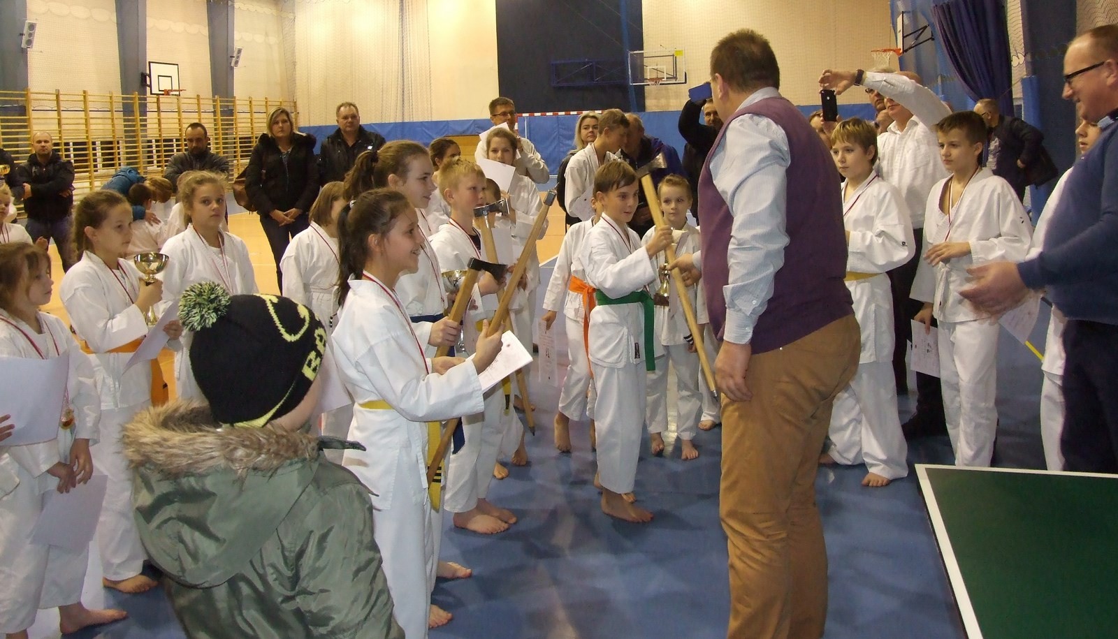 Choć czasy kiedy górale walczyli na ciupagi odeszły w zapomnienie (…choć nie zawsze i nie wszędzie !), teraz młode pokolenie, dalecy potomkowie Hetmanów Zbójnickich: Klimczoka, Sebastiana Burego z Milówki, Jerzego Fiedora (Proćpoka), Andrzeja Szebesty (Ondraszka) czy Jury Janosika, walczyło o symboliczne Ciupagi Harnasiów. Cztery takie niezwykłe i dla nas – mieszkańców naszej gminy, niezwykle cenne trofea ufundowane zostały przez posła na sejm RP Kazimierza Matusznego. Karatecy rywalizowali w dwóch konkurencjach walk kumite oraz układów technik kata, gdzie w konkurencji open toczyły się zażarte boje, których celem było zdobycie ciupagi zbójników.
