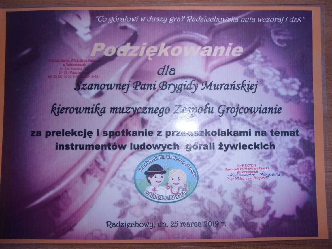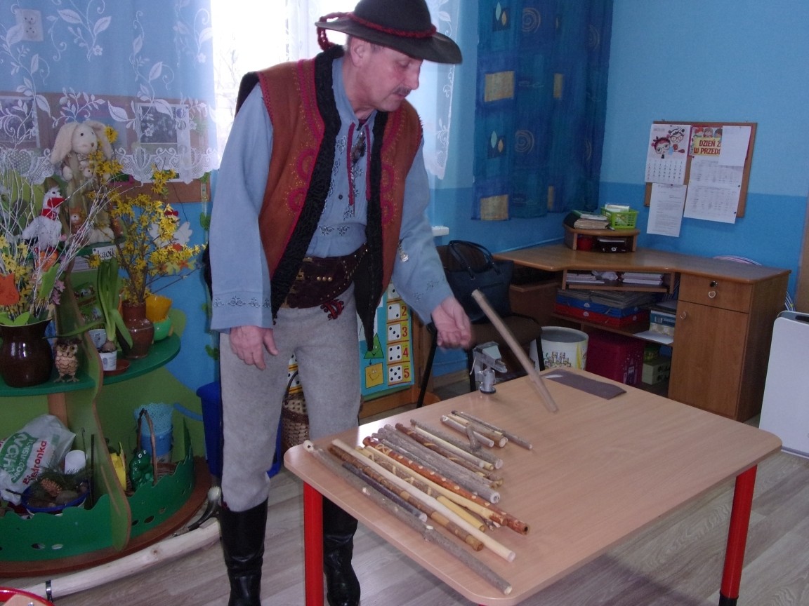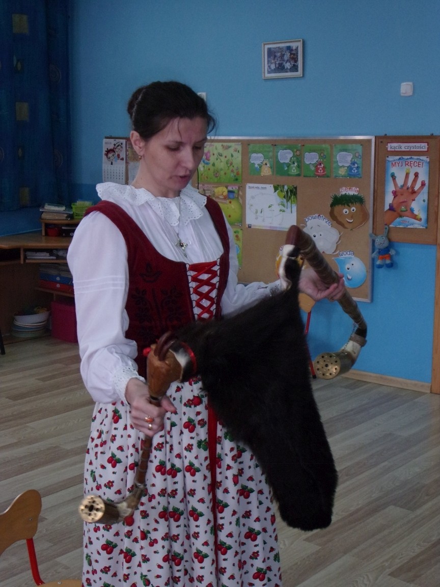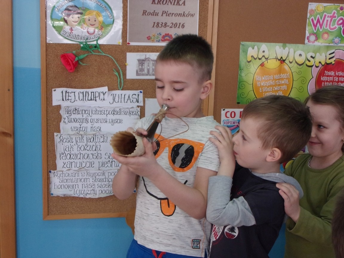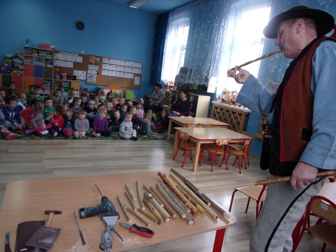 Odpowiedzi na to pytanie poszukują od kilku tygodni wychowankowie Przedszkola im. Władysława Pieronka w Radziechowach. Realizacja regionalnego projektu edukacyjnego na temat życia muzycznego w naszym regionie zakłada badanie środowiska muzycznego towarzyszącego góralom żywieckim przez całe ich życie. Dzwon kościelny wyznaczający rytm życia, organy kościelne towarzyszące wszystkim ważnym wydarzeniom, orkiestra dęta podczas uroczystości i w chwilach odpoczynku po ciężkiej pracy… Od zarania dziejów ludzie próbowali ukoić trudy życia muzyką. Najlepiej tą najprostszą, dostępną dla każdego. Już małe dzieci tworzyły piszczałki ze słomy, gęsiego pióra, dzikiego bzu. Pogwizdywały kupionymi na targu glinianymi ptaszkami, grały na ulepionych z gliny okarynach. Wraz z ich wzrastaniem przychodziła pora na umilanie pasterskiej pracy grą na rogach pasterskich, trombitach, fujarkach. Te wszystkie piękne historie opowiedzieli dzieciom zaproszeni do przedszkola folkloryści: Brygida Murańska – kierownik muzyczny zespołu Grojcowianie, poetka i Grzegorz Brodka – twórca tradycyjnych instrumentów pasterskich, poeta ludowy. Pani Brygida oprócz tych prostych pasterskich zaprezentowała dzieciom bardziej skomplikowane instrumenty. I tak w całym przedszkolu rozległy się dźwięki skrzypiec i heligonki. Ogromne zainteresowanie wzbudziły dudy. Z każdej nuty i śpiewu pani Brygidy wyłania się umiłowanie muzyki. Rodzina Wrzeszczów, z której wywodzi się pani Brygida Murańska z Juszczyny muzykuje od wielu pokoleń. Pan Grzegorz Brodka przybył na spotkanie z przedszkolakami z całym warsztatem. Dzieci z zachwytem obserwowały, jak na ich oczach powstaje piszczałka wielkopostna. Według tradycji góralskiej Jedynie dźwięk tego instrumentu mógł się bezkarnie rozlegać w okresie Wielkiego Postu poprzedzającego Wielkanoc. Przedszkolaki próbowały swoich sił wydobywając dźwięki z ogromnych rogów pasterskich jaworowych i świerkowych. Donośny wakat, czyli swoista „perkusja” góralska wywołał radość u małych muzyków. Wszystkie te instrumenty Pan Grzegorz wykonuje własnoręcznie.