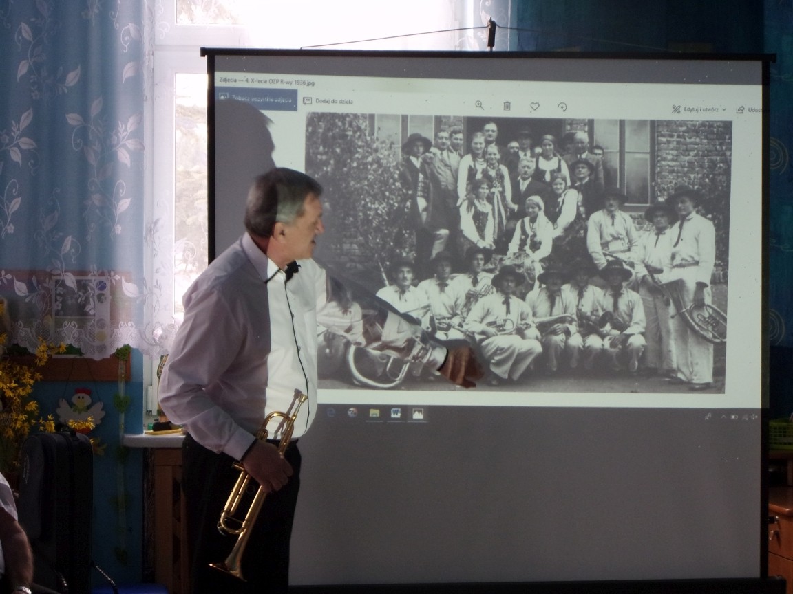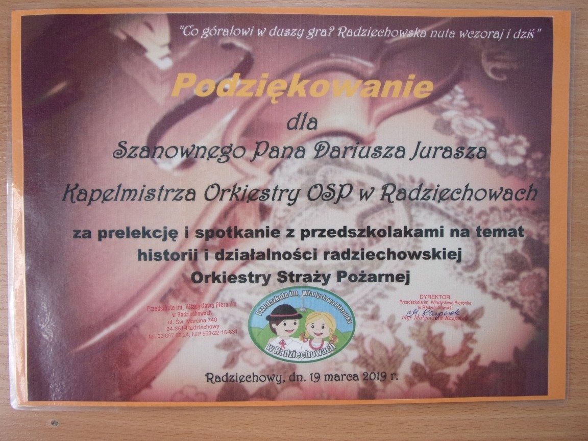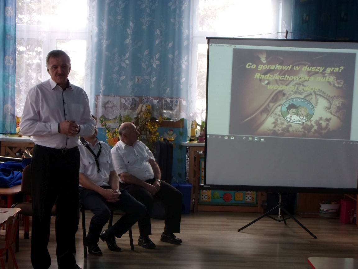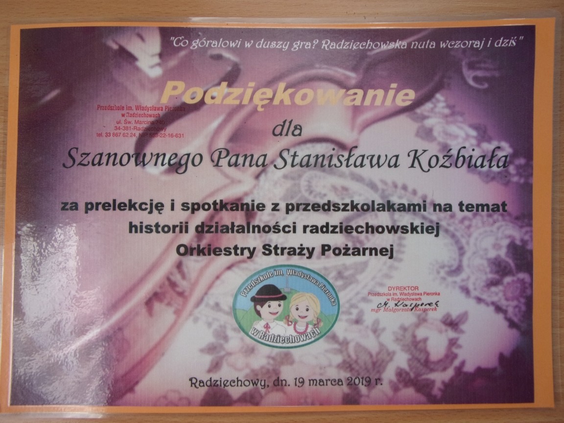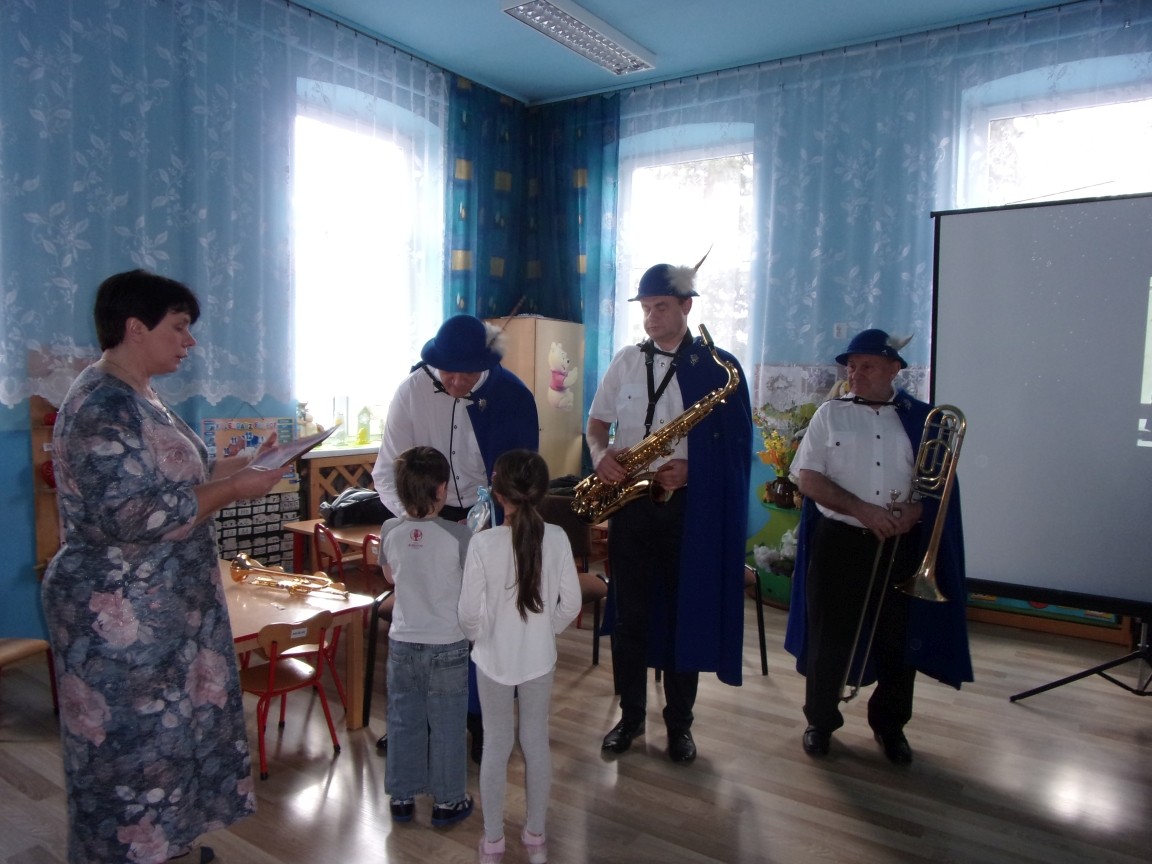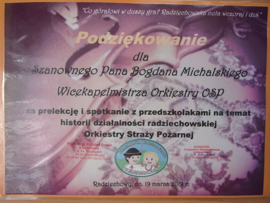 Przedszkole im. Władysława Pieronka w Radziechowach od wielu lat zajmuje się tematyką regionalną i badaniem historii Radziechów. W tym roku przyszła pora na realizację projektu o życiu muzycznym naszej miejscowości „Co góralowi w duszy gra? Radziechowska nuta wczoraj i dziś”. Spotkanie z przedszkolakami w dniu 19 marca 2019r. poświęcone było poznawaniu historii i aktualnej działalności Orkiestry Dętej przy Ochotniczej Straży Pożarnej w Radziechowach. W progi przedszkola zawitali wieloletni członkowie orkiestry: wicekapelmistrz Bogdan Michalski oraz instrumentaliści: Stanisław Koźbiał i Zdzisław Piecuch.