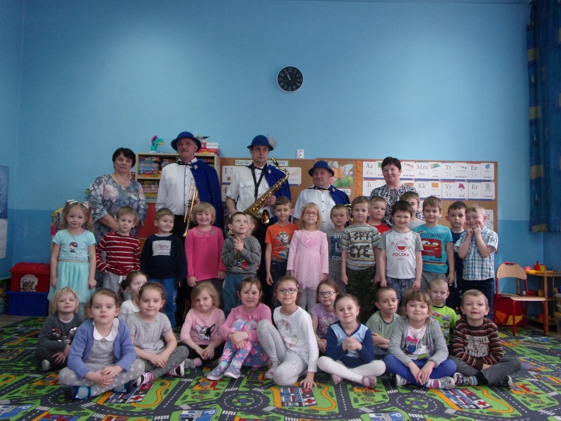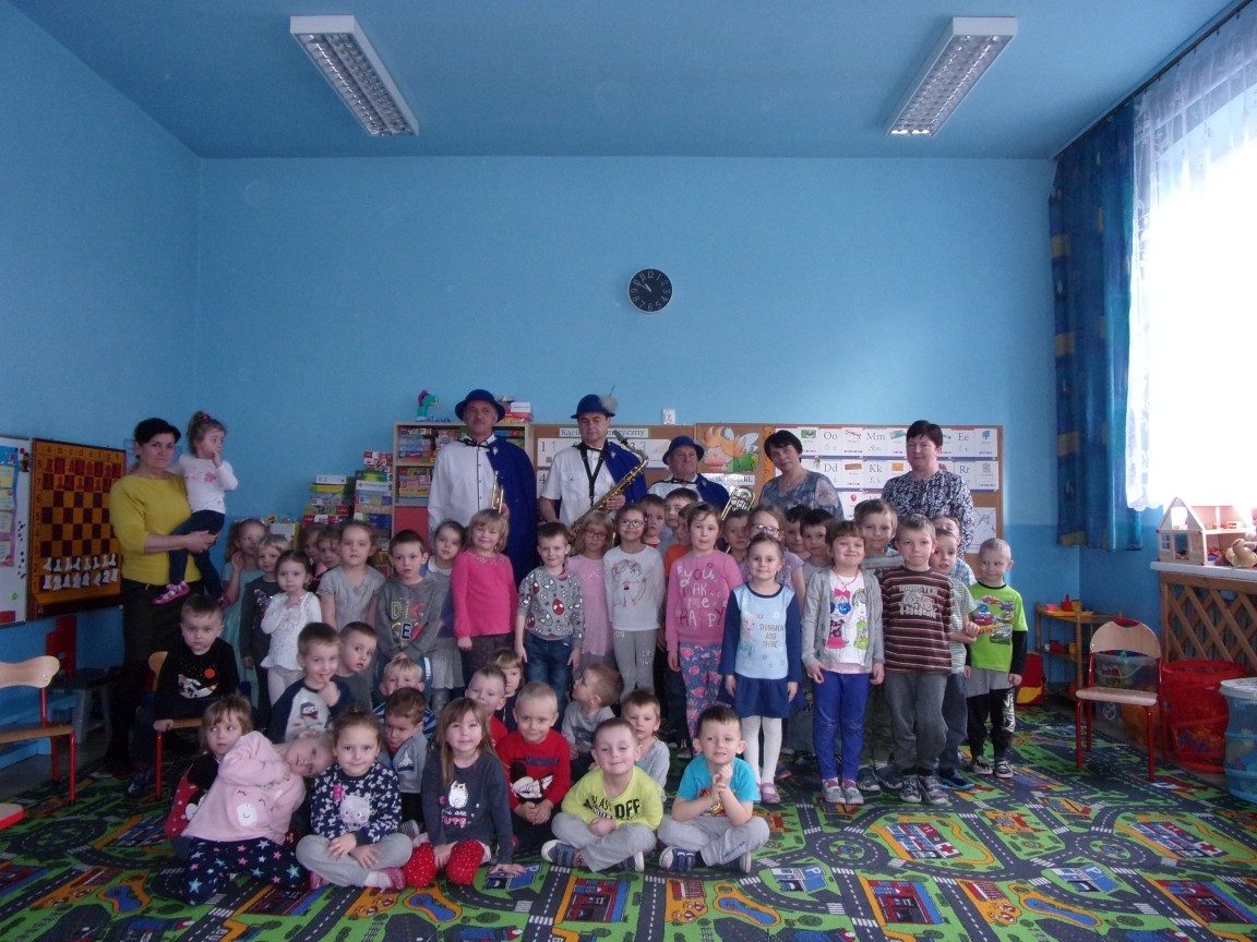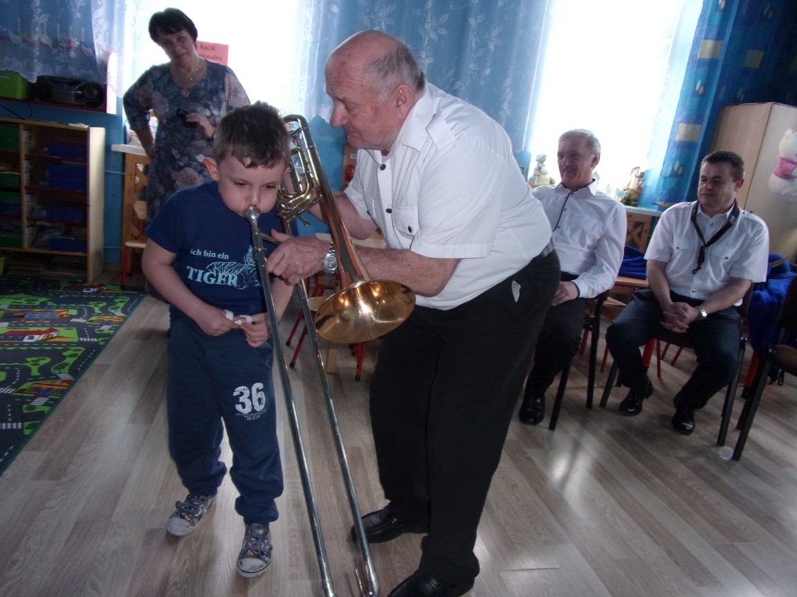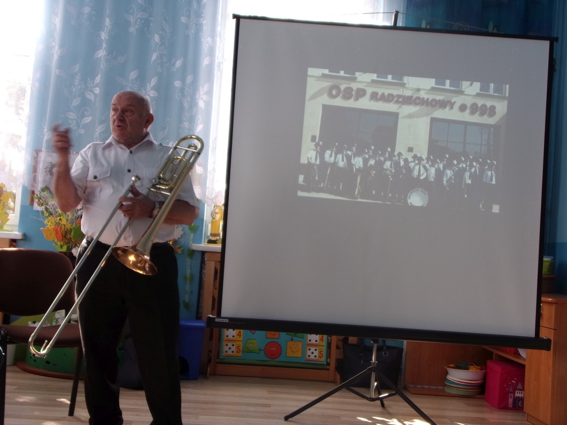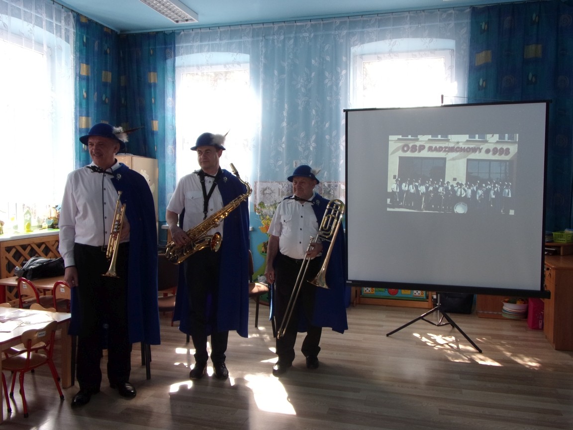 Potem nastały wyjątkowo ciężkie dla Radziechów czasy II wojny światowej. Również powojenny czas nie sprzyjał dobrej organizacji orkiestry. Pan Stanisław Koźbiał puzonista , chyba najstarszy członek orkiestry opowiedział o początkach swojej muzycznej drogi. W czasach jego dzieciństwa nie było szkoły muzycznej. Jako 9-letni chłopiec uczęszczał na naukę gry do Domu Harcerza w Żywcu. Panowie Bogusław Michalski i Zdzisław Piecuch mieli już możliwość uczęszczania do Szkoły Muzycznej. Przez wiele lat po wojnie prężnie działała orkiestra dęta przy Zakładach Papierniczych „Solali” w Żywcu, która składała się w przeważającej części z radziechowian. Po jej rozwiązaniu muzycy zorganizowali się przy OSP w Radziechowach pod kierownictwem najpierw Andrzeja Króla, a potem Dariusza Jurasza. Pan Dariusz Jurasz od 2001r. do dzisiaj pełni funkcję kapelmistrza. Spotkanie przebiegło w bardzo miłej atmosferze. Znacząco poszerzyła się wiedza przedszkolaków na temat instrumentów dętych. Pan Bogusław pięknie opowiedział dzieciom o zaletach trąbki, Pan Zdzisław zaprezentował wyjątkowe brzmienie saksofonu. Motywy z bajek dla dzieci grane przez Pana Stanisława na puzonie wywołały zachwyt przedszkolaków.