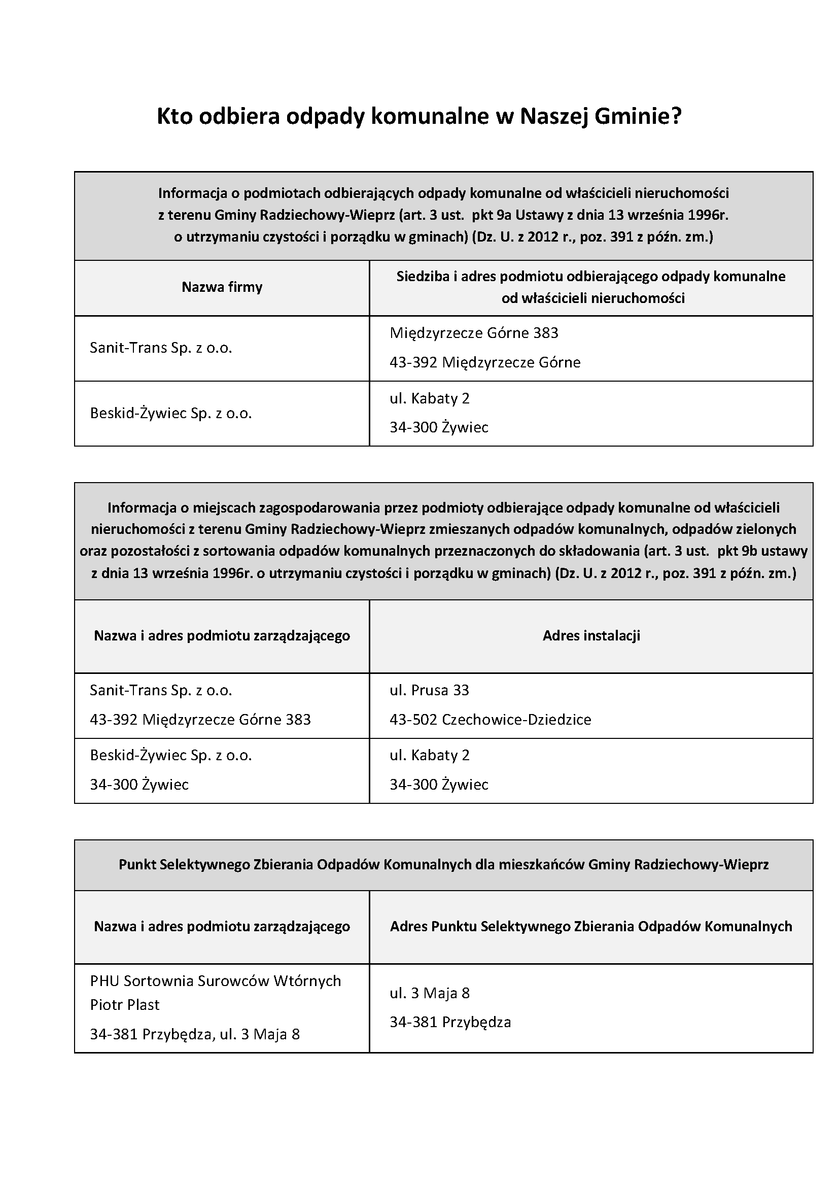 - Odpady segregowane – raz w miesiącu w każdym sołectwie.