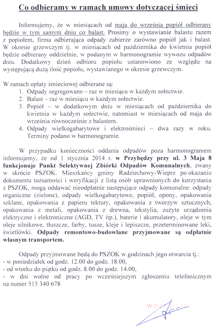 W przypadku konieczności oddania odpadów poza harmonogramem informujemy, że od 1 stycznia 2014 r. w Przybędzy przy ul. 3 Maja 8 funkcjonuje Punkt Selektywnej Zbiórki Odpadów Komunalnych, zwany w skrócie PSZOK.