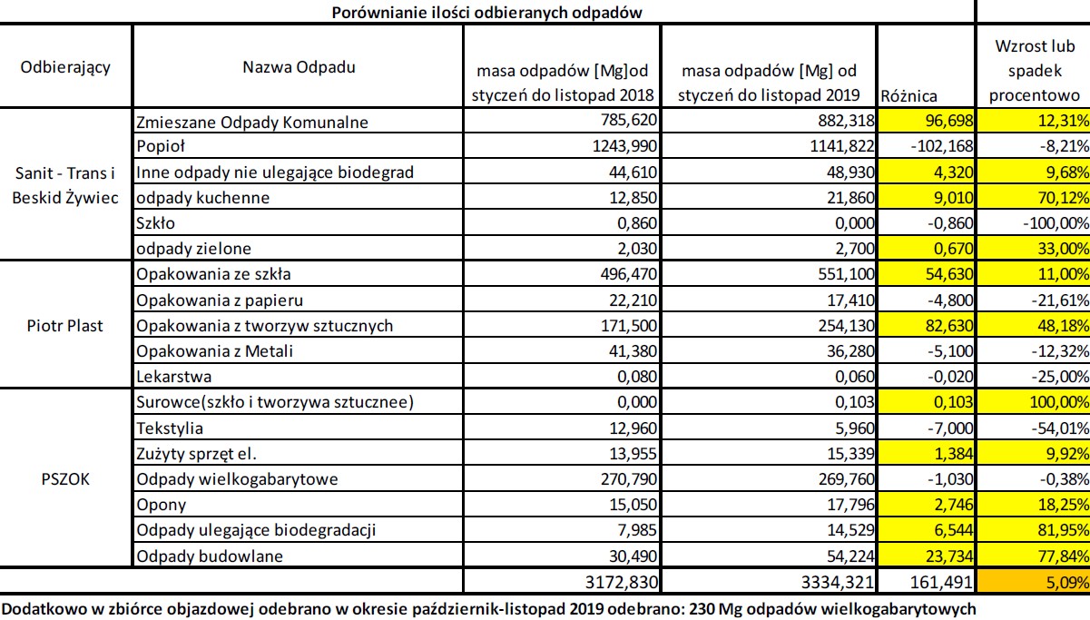 Z budżetu Gminy dodatkowo na gospodarkę odpadami w tym roku dołożono około 500 000 zł. Tak więc faktycznie odpady nie kosztowały 13 zł od osoby, ale realne koszty wyniosły około 18 zł. Z tabelki dołączonej do artykułu wynika, że ogólna ilość odpadów wzrasta, co jest wynikiem wzrostu konsumpcji - wzrastają zmieszane odpady komunalne, odpady opakowaniowe ze szkła i tworzyw sztucznych oraz odpady remontowo-budowlane. Oszacowano, że na terenie Gminy zostanie odebranych w 2020 r. około 3700 Mg (ton) odpadów komunalnych. Ludzie więcej kupują więcej wydają i robią remonty. Największym problemem jest nie samo zbieranie odpadów, ale ich zagospodarowanie - firmy skupujące surowce oferują za nie bardzo niskie ceny - można to sprawdzić na stronie internetowej np. firmy Dil z Rybarzowic czy Ekowtór z Wilkowic. Wzrosła również opłata marszałkowska za składowanie odpadów na składowisku odpadów, z kolei paliwa alternatywnego (RDF) jest na tyle dużo, że elektrociepłownie, ciepłownie i cementownie nie płaca już za to paliwo a wręcz żądają dopłaty za jego spalenie. Do tego dochodzi podwyższenie płacy minimalnej, wzrostem cen energii czy koniecznością spełnienia wyższych wymogów recyklingowych narzuconych przez Unię Europejską. Te koszty firmy odbierające odpady muszą przerzucić na Gminę. Niewątpliwie na podwyżki cen odbioru odpadów również duży wpływ ma nowelizacja Ustawy z dnia 13 września 1996 roku o utrzymaniu czystości i porządku w gminach, gdzie ustawodawca narzuca gminom maksymalne stawki opłat dla nieruchomości na których prowadzona jest działalność gospodarcza, które często są niższe niż dotychczas. Problem ten dotyczy nie tylko Naszej Gminy - w całym powiecie żywieckim podnoszone są lub będą stawki za gospodarowanie odpadami komunalnymi dla mieszkańców.