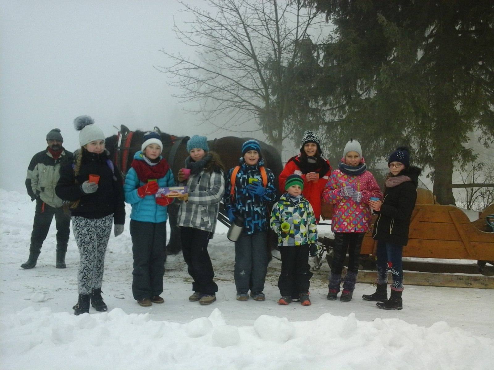 Ponieważ było wyjątkowo mroźno, a to nie był koniec atrakcji, jakie w tym dniu czekały na uczestników wycieczki, ogrzaliśmy się gorącą herbatką, dostarczyliśmy sobie potrzebnych kalorii, a następnie wyruszyliśmy w drogę powrotną. Tym razem w rolę „woźniczego” wcielił się uczeń kl. Va Bartek Konior, który pod czujnym okiem fachowca, szczęśliwie przywiózł nas na miejsce do leśniczówki. Tam oddaliśmy się szaleństwu na śniegu - zabawa była naprawdę wyśmienita i na długo zostanie w naszej pamięci.