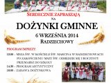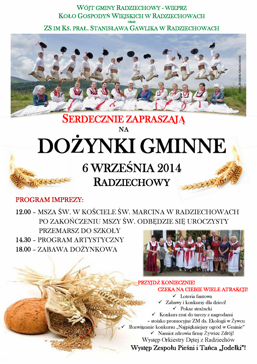Serdecznie zapraszamy na DOŻYNKI GMINNE 6 WRZEŚNIA 2014 w RADZIECHOWACH. Rozpoczęcie o godzinie 12.00 – Mszą Święta w Kościele Św. Marcina w Radziechowach.