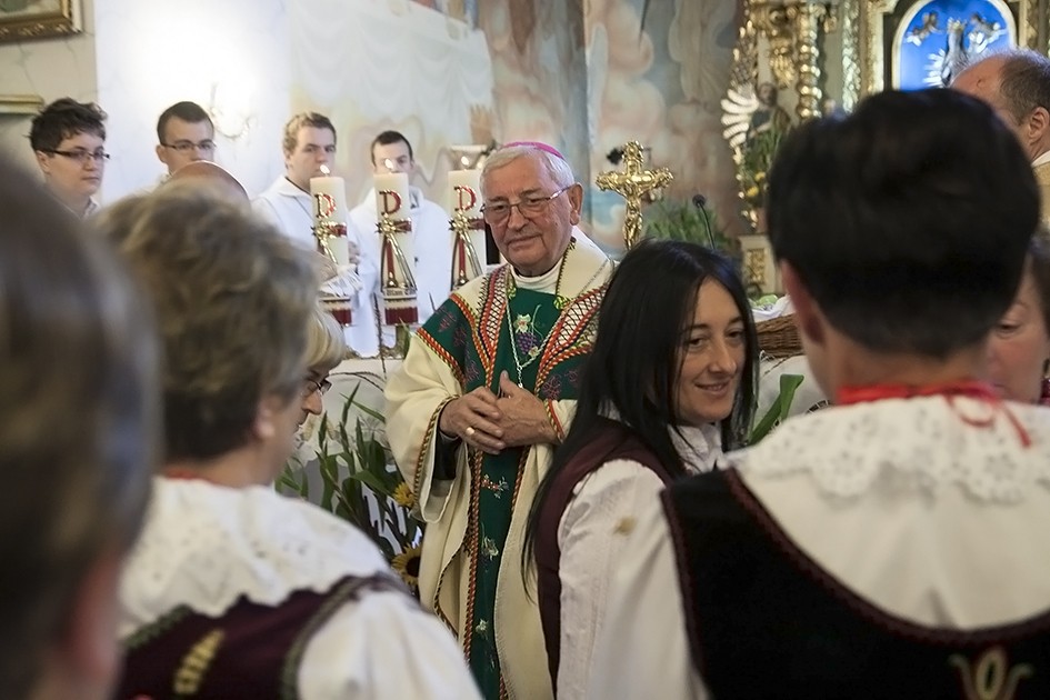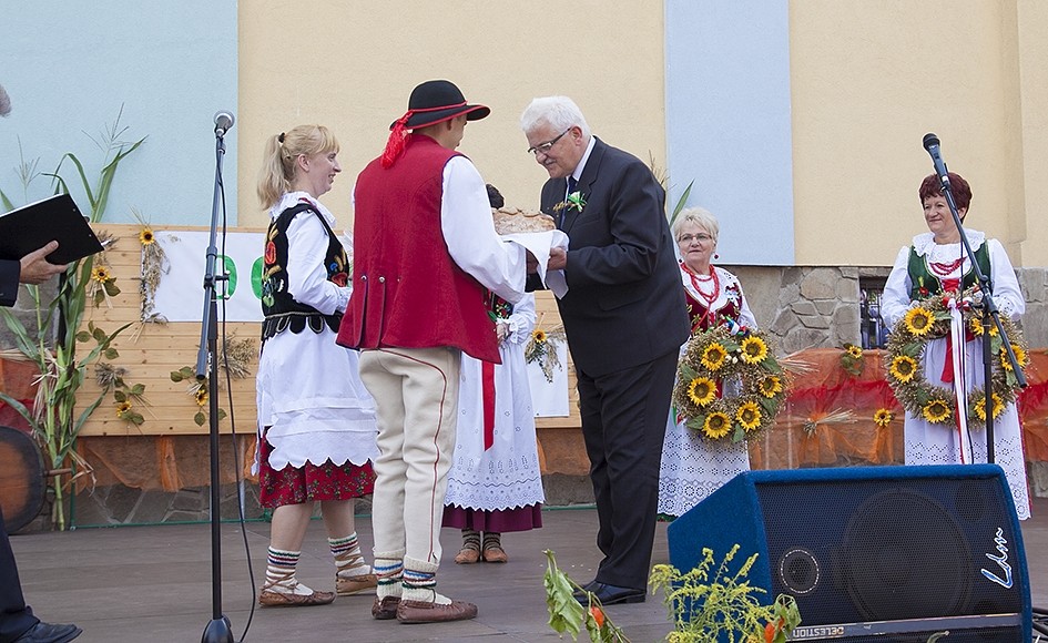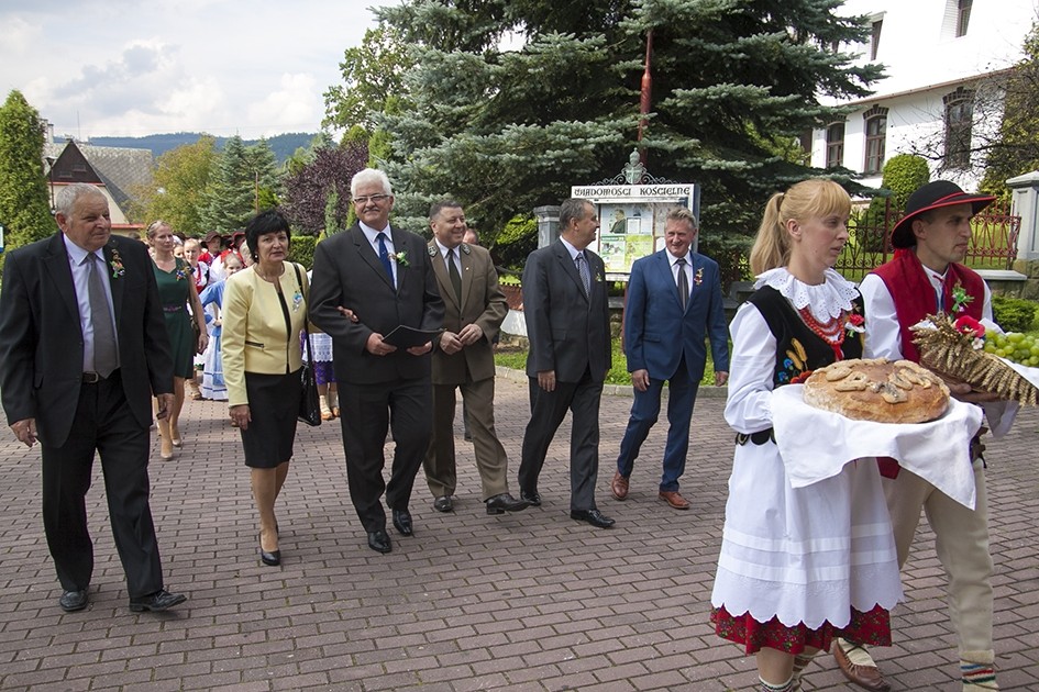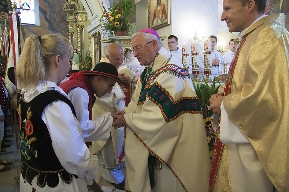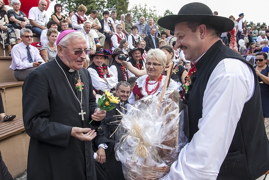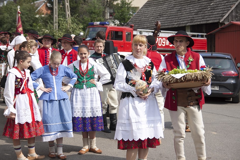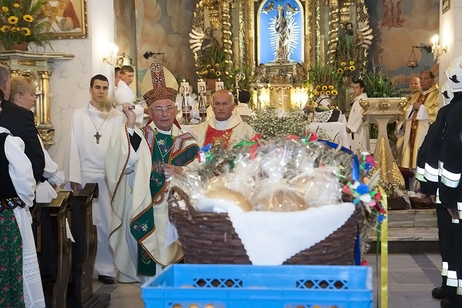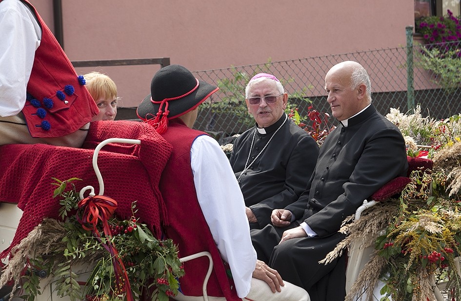 Tłoczno i uroczyście było na sobotniej dziękczynnej Mszy Świętej o godzinie 12.00 w Radziechowach. Rolnicy, Koła Gospodyń Wiejskich, a także przedstawiciele Ochotniczej Straży Pożarnej i Związku Podhalan wraz z władzami Gminy Radziechowy-Wieprz i zaproszonymi gośćmi wnieśli do świątyni dary i gorące podziękowania, za każdy plon zrodzony w tym trudnym dla rolników roku. Posługę kapłańską tego dnia sprawowali proboszczowie wszystkich parafii na terenie naszej gminy na czele z witającym gości ks. Ryszadrem Kubasiakiem, proboszczem Parafii Radziechowskiej. Pouczające kazanie tego dnia wygłosił gościnnie przewodniczący sprawowaniu Eucharystii Biskup Tadeusz Pieronek. Gdy dobiegły końca uroczystości w Kościele pw. św. Marcina w Radziechowach, odbyło się jeszcze uroczyste poświęcenie nowego samochodu strażackiego zakupionego pod koniec sierpnia przez OSP w Radziechowach. Po zakończeniu religijnej części obchodów Dożynek długi korowód prowadzony przez Orkiestrę Dętą z Radziechów powędrował w stronę Zespołu Szkół im. ks. prał. Stanisława Gawlika w Radziechowach, gdzie na gości czekał wyśmienity obiad oraz liczne atrakcje. Część artystyczną programu otworzyło tradycyjne przekazanie przez tegorocznych starostów dożynek – państwa Monikę i Sebastiana Rybarskich – chleba i miodu Panu Grzegorzowi Figurze Wójtowi Gminy Radziechowy-Wieprz.