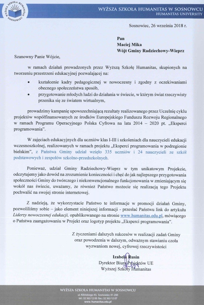 Gmina Radziechowy-Wieprz, do grona liderów, dołączyła dzięki adekwatnemu wykorzystaniu środków unijnych. Do udziału w projekcie „Eksperci programowania w podregionie bielskim” Gmina skierowała 335 uczniów i 24 nauczycieli.
