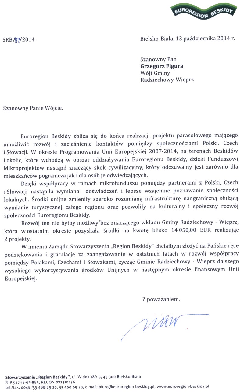 W imieniu Zarządu Stowarzyszenia „Region Beskidy" chciałbym złożyć na Pańskie ręce podziękowania i gratulacje za zaangażowanie w ostatnich latach w rozwój współpracy pomiędzy Polakami, Czechami i Słowakami, życząc Gminie Radziechowy - Wieprz dalszego wysokiego wykorzystywania środków Unijnych w następnym okresie finansowym Unii Europejskiej.