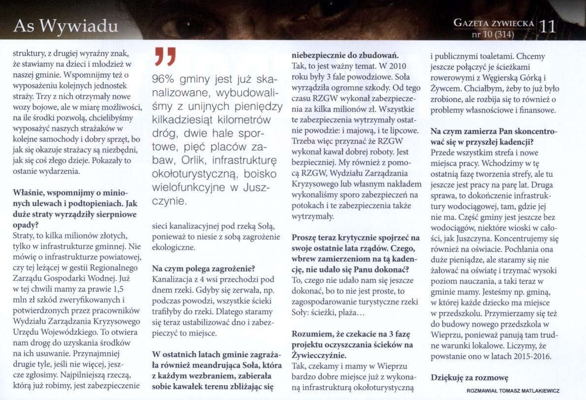 GAZETA ŻYWIECKA: rozmowa z Wójtem Gminy Radziechowy-Wieprz [nr 10 październik 2014]