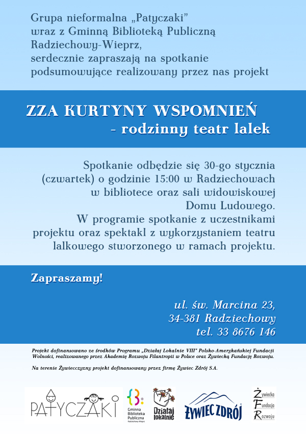 Projekt realizowany był w Radziechowach przez grupę nieformalną „Patyczaki”, dofinansowany w ramach Programu „Działaj Lokalnie VIII”. W ramach naszych działań powstał teatr lalkowy – kukiełki oraz dekoracje, dzieci napisały scenariusze i przygotowały specjalnie dla Was przedstawienie teatralne.