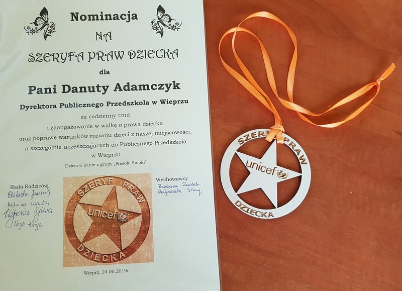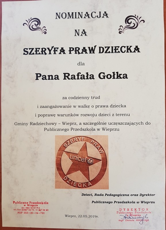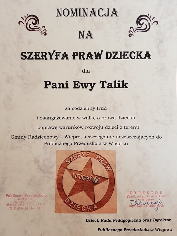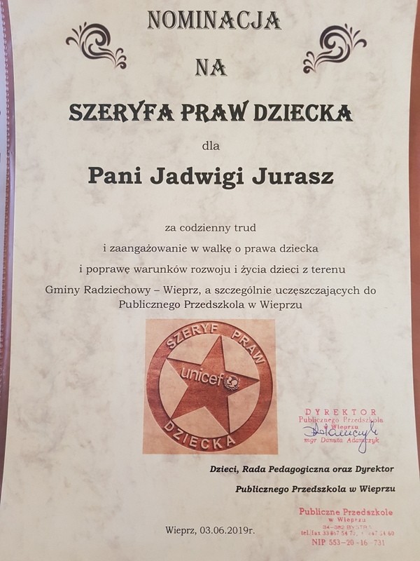 Decyzją Rady Pedagogicznej Publicznego Przedszkola w Wieprzu oraz przedszkolaków nominowano na Szeryfa Praw Dziecka: