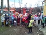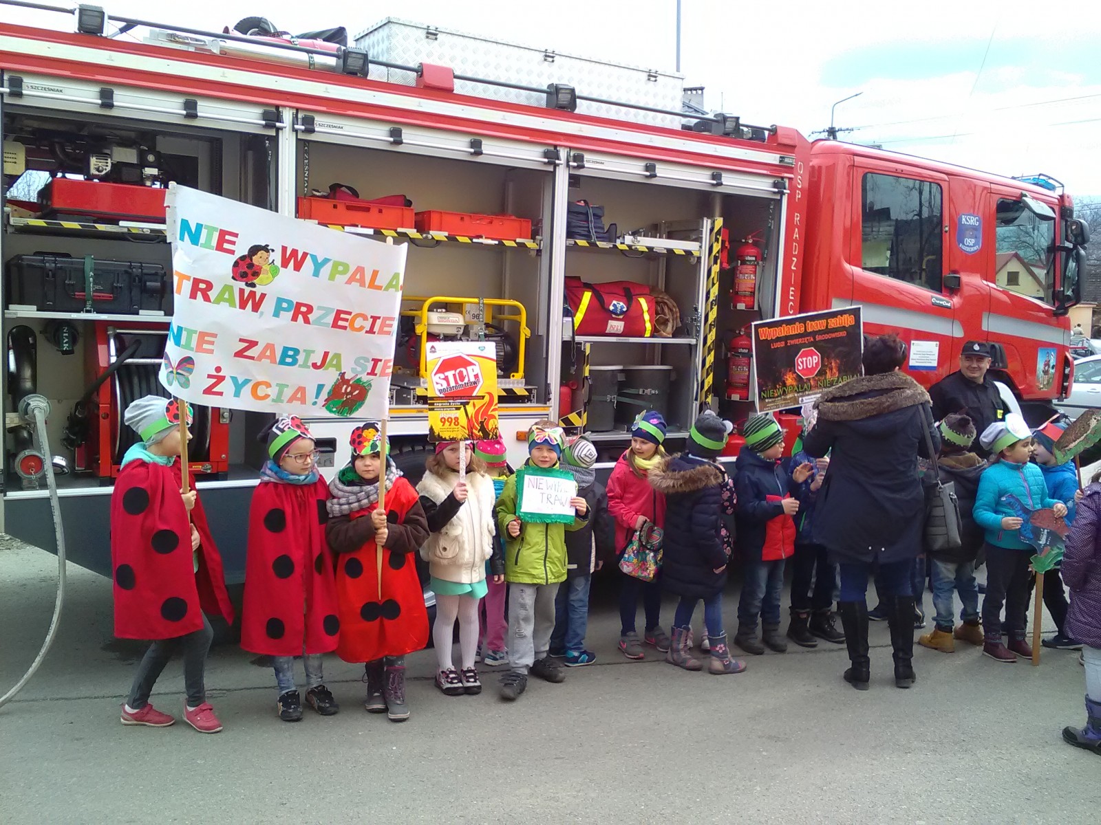 Dzieci przebrane za zwierzęta żyjące na łące, niosące plakaty i transparenty, nawiązujące do zgubnego wypalania traw, przeszły w korowodzie ulicami Radziechów nawołując do zaprzestania wypalania traw. Były również ulotki rozdawane przechodniom, ekologiczne okrzyki i piosenki. Na zakończenie happeningu dzieci zgromadziły się przy budynku Ochotniczej Straży Pożarnej w Radziechowach, gdzie panowie Strażacy przygotowali i przeprowadzili ciekawe zajęcia dotyczące kwestii wypalania traw, która uświadamiała wszystkich, że wypalanie nieużytków jest nie tylko niebezpieczne dla ludzi i przyrody, lecz także nieopłacalne i karalne. Strażacy zaprezentowali uczniom pojazd ratowniczo - gaśniczy, szczegółowo omówili wszystkie tajemnicze przedmioty znajdujące się w jego wyposażeniu. Najwięcej radości sprawiły uczniom działania praktyczne: przymierzanie strażackich kombinezonów, oglądanie wnętrza pojazdu czy polewanie wodą "palącej się” trawy.