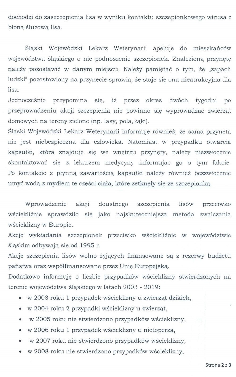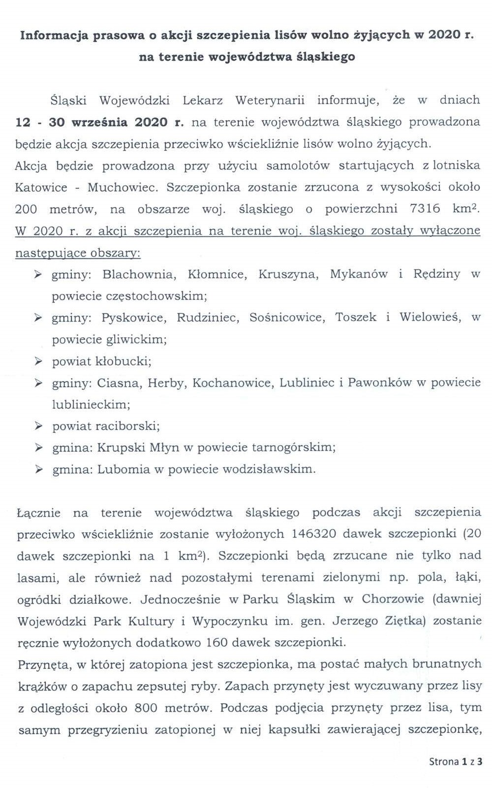 Informacja prasowa o akcji szczepienia lisów wolno żyjących w 2020r. na terenie województwa śląskiego