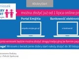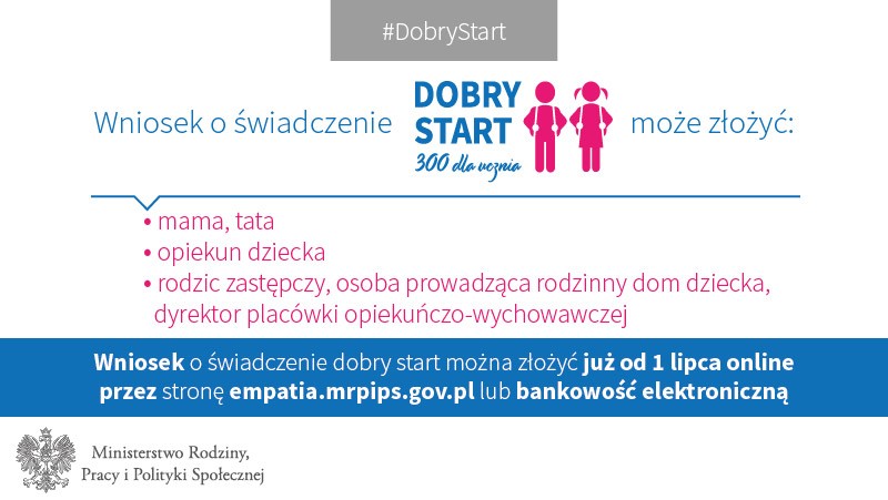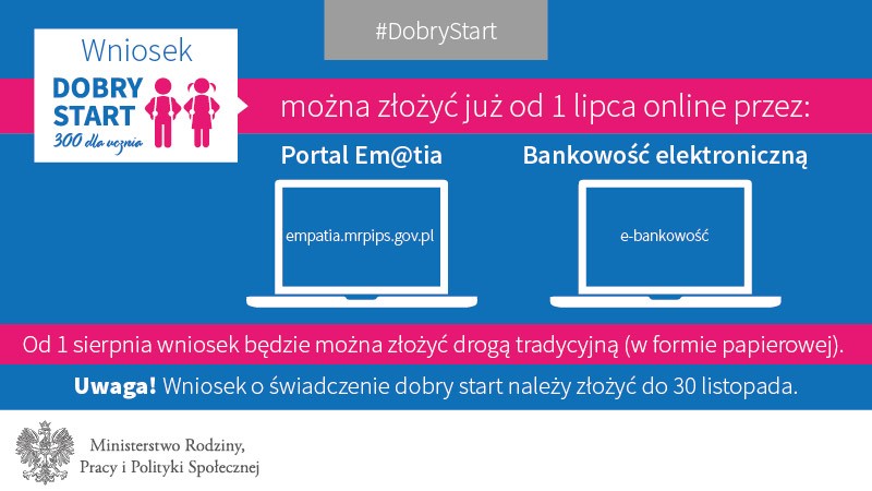 Uprzejmie informujemy, że w związku z wejściem w życie z dniem 1 czerwca 2018 r. rozporządzenia Rady Ministrów z dnia 30 maja 2018 r. w sprawie szczegółowych warunków realizacji rządowego programu „Dobry start” (Dz. U. poz. 1061) wnioski o świadczenie z Programu Rządowego „Dobry start” będzie można składać drogą elektroniczną poprzez bankowość elektroniczną i ministerialny portal Emp@tia od 1 lipca 2018 r., a drogą papierową od 1 sierpnia 2018 r.