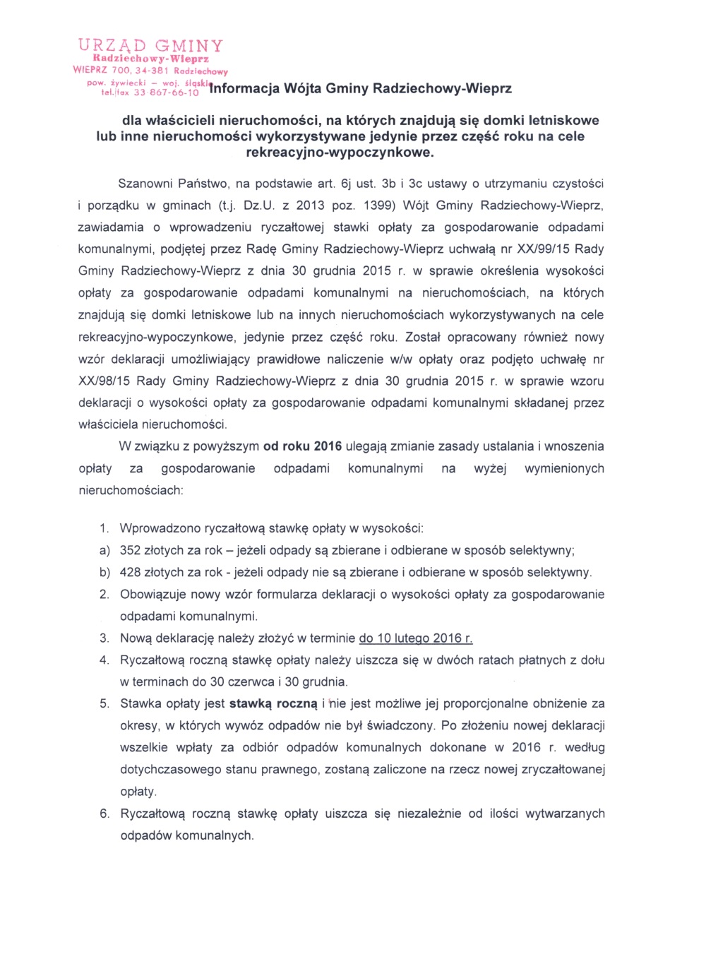 Szanowni Państwo, na podstawie art. 6j ust. 3b i 3c ustawy o utrzymaniu czystości i porządku w gminach (t.j. Dz.U. z 2013 poz. 1399) Wójt Gminy Radziechowy-Wieprz, zawiadamia o wprowadzeniu ryczałtowej stawki opłaty za gospodarowanie odpadami komunalnymi, podjętej przez Radę Gminy Radziechowy-Wieprz uchwałą nr XX/99/15 Rady Gminy Radziechowy-Wieprz z dnia 30 grudnia 2015 r. w sprawie określenia wysokości opłaty za gospodarowanie odpadami komunalnymi na nieruchomościach, na których znajdują się domki letniskowe lub na innych nieruchomościach wykorzystywanych na cele rekreacyjno-wypoczynkowe, jedynie przez część roku. Został opracowany również nowy wzór deklaracji umożliwiający prawidłowe naliczenie w/w opłaty oraz podjęto uchwałę nr XX/98/15 Rady Gminy Radziechowy-Wieprz z dnia 30 grudnia 2015 r. w sprawie wzoru deklaracji o wysokości opłaty za gospodarowanie odpadami komunalnymi składanej przez właściciela nieruchomości.