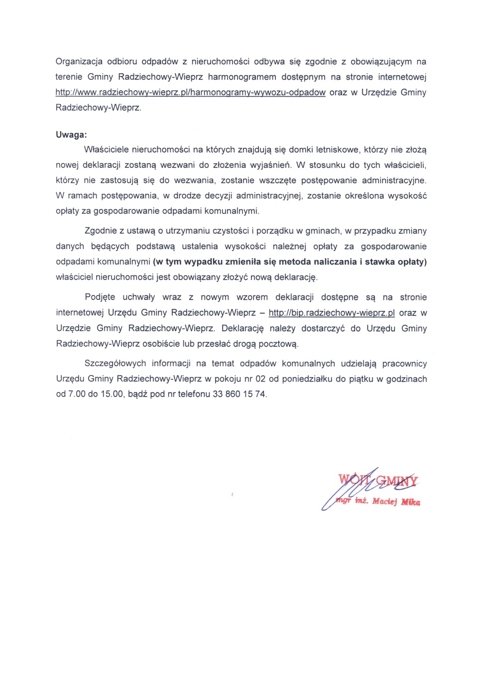 Szczegółowych informacji na temat odpadów komunalnych udzielają pracownicy Urzędu Gminy Radziechowy-Wieprz w pokoju nr 02 od poniedziałku do piątku w godzinach od 7.00 do 15.00, bądź pod nr tel: 33 860 15 74.