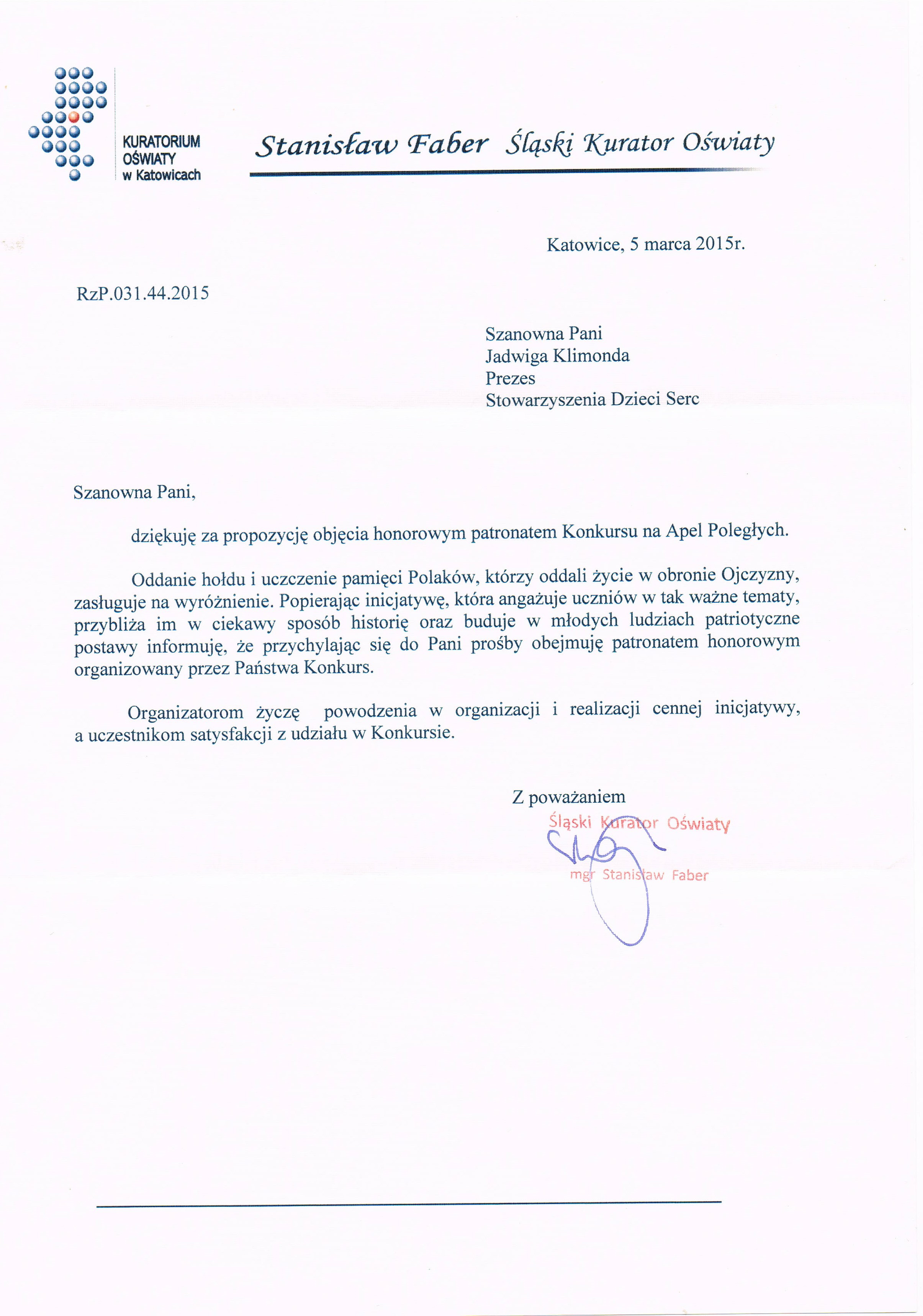 Termin: Prace należy nadsyłać do 29 kwietnia 2015 - rocznica ,,Cudu w Dachau (decyduje data stempla pocztowego), pod adresem: Dzieci Serc ul. Abramska 2 34 – 381 Radziechowy z dopiskiem ,,Apel Poległych”- konkurs. Konkurs zostanie rozstrzygnięty do 15 maja 2015, po czym niezwłocznie nastąpi publiczne ogłoszenie wyników i rozdanie nagród. Treść wyłonionego w Konkursie ,,Apelu Poległych” zostanie odczytana w dniu 3.10.2015 r. podczas Zaduszek Narodowych w Radziechowach, na górze Matysce.