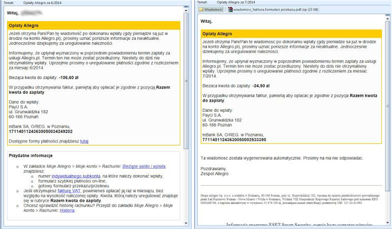 Maile przypominają oczywiście wiadomości, jakie zwykle otrzymują klienci czy abonenci danej firmy, z tym że trafiają one także do osób z danymi firmami niezwiązanych. Podszywając się pod Allegro przestępcy rozsyłają między innymi złośliwe oprogramowanie, spakowane w archiwum ZIP, podobnie jak miało to miejsce w mailach udających faktury UPC. Ciekawszą formą ataku jest jednak wiadomość łudząco podobna do tej, jaką otrzymują użytkownicy portalu aukcyjnego, jeśli nie dokonają wpłaty na czas. Od oryginalnej (po lewej) różni się między innymi brakiem odnośnika do informacji o wpłacie, brakiem imienia użytkownika i oczywiście numerem konta bankowego – to po prawej bynajmniej do PayU nie należy i pod żadnym pozorem nie należy przelewać na nie pieniędzy.