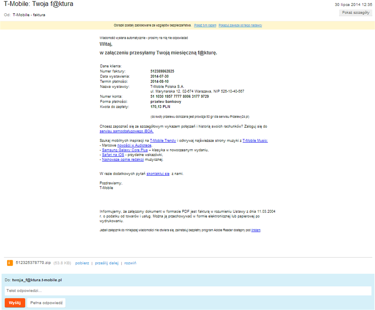 Pomysłowo przestępcy rozsyłają także wiadomości udające faktury od T-Mobile. Tradycyjnie, w załączniku znajduje się szkodnik. T-Mobile zapewnia, że nie ma z tą korespondencją nic wspólnego i podejmie wszelkie możliwe kroki, aby ten proceder ukrócić.