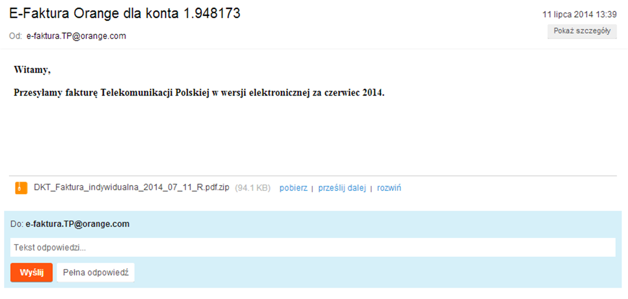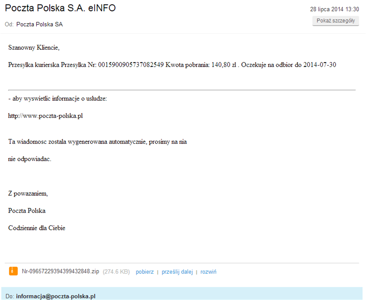 Bardzo proste, ale nie mniej szkodliwe wiadomości, rozsyłane są z domen Orange.com. Tu znów trzeba uważać na spakowany załącznik. Poczta Polska z kolei informuje o możliwości odebrania przesyłki za pobraniem.