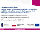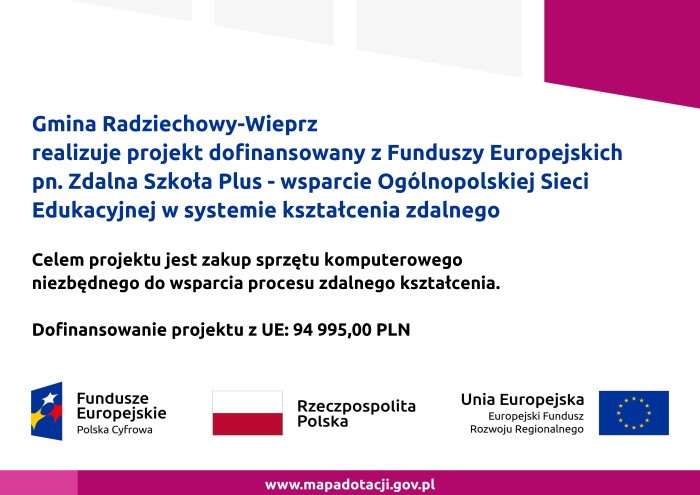 Projekt finansowany jest ze środków Europejskiego Funduszu Rozwoju Regionalnego w ramach Programu Operacyjnego Polska Cyfrowa 2014-2020, Oś Priorytetowa I Powszechny dostęp do szybkiego Internetu, Działanie 1.1 „Wyeliminowanie terytorialnych różnic w możliwości dostępu do szerokopasmowego Internetu o wysokich przepustowościach” – Program Zdalna Szkoła+ w ramach Ogólnopolskiej Sieci Edukacyjnej.