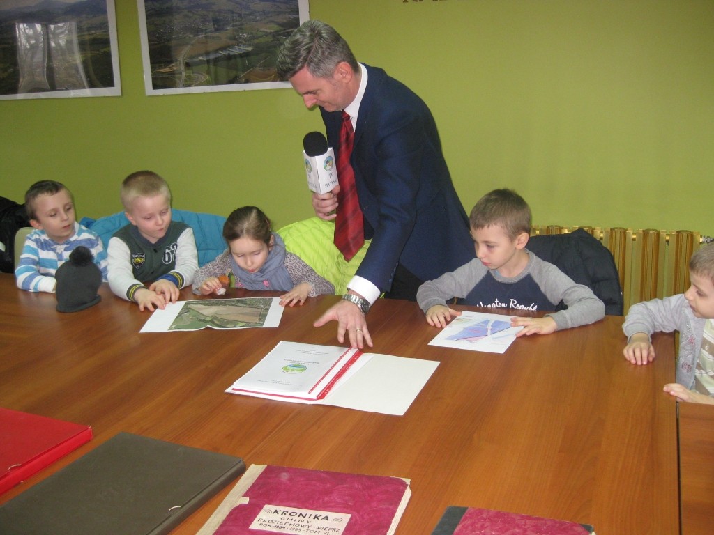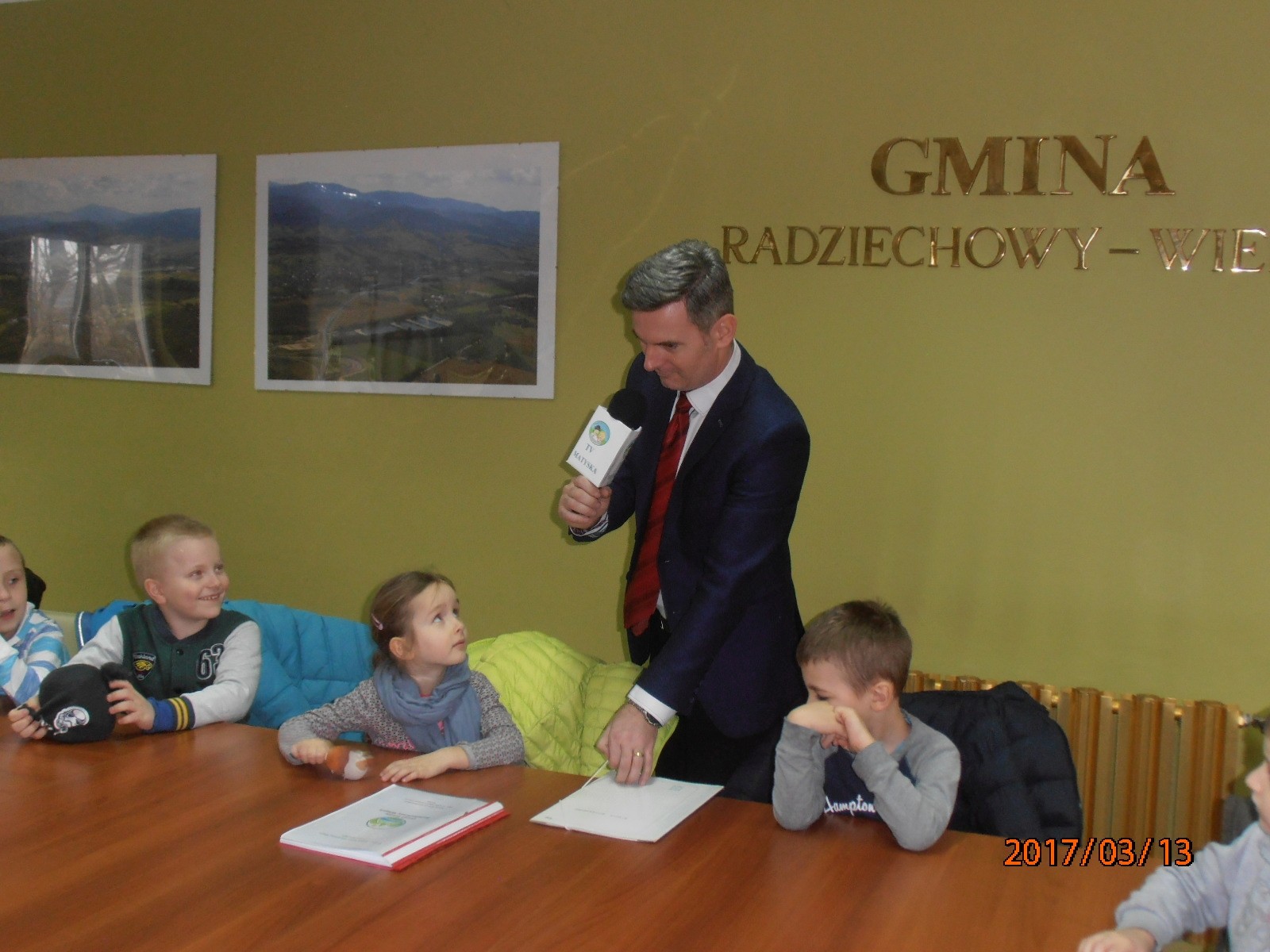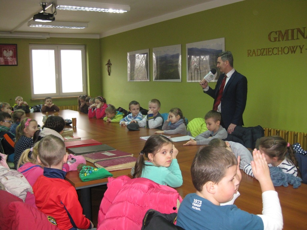 Przedszkole im. Władysława Pieronka w Radziechowach od wielu lat realizuje tematykę regionalną. W poprzednich latach dzieci zajmowały się sztuką ludową na terenie naszej gminy, zmianami w krajobrazie rodzinnej miejscowości, tworzeniem kroniki rodu znaczącego dla Radziechów. Ten ostatni projekt zaowocował wyborem patrona i przyjęciem nazwy „Przedszkole im. Władysława Pieronka w Radziechowach”. W bieżącym roku przedszkolaki pod kierunkiem wychowawczyń postanowiły zająć się badaniem wykorzystania potencjału historycznego, przyrodniczego i kulturowego miejscowości Radziechowy dla jej rozwoju. W tym celu został opracowany regionalny projekt edukacyjny pod nazwą „Gdzie jesteśmy… Dokąd zmierzamy… Nasza przyszłość w Radziechowach”. Główne założenia projektu, to badanie potencjału i walorów naszej miejscowości pod kątem wykorzystania go dla jej rozwoju i tworzenia coraz lepszych warunków życia dla społeczeństwa w przyszłości. Co możemy wspólnie stworzyć? Z czego możemy być dumni w przyszłości? Dokąd zmierzamy? Poszukiwanie odpowiedzi na te pytania rozpoczęliśmy od wycieczki do Urzędu Gminy w Radziechowach i spotkania z Panem Maciejem Miką Wójtem Gminy Radziechowy-Wieprz. Po serdecznym powitaniu w swoim gabinecie Pan Wójt oprowadził dzieci po urzędzie tłumacząc, jakie sprawy są w nim załatwiane przy wsparciu urzędników. Najwięcej atrakcji przygotowano dla przedszkolaków w sali sesyjnej. Na gości oczekiwały przygotowane do wglądu materiały historyczne w postaci kronik gminnych, foldery gminne ukazujące aktualną rzeczywistość gminną oraz dokument wybiegający w przyszłość, czyli „Program rozwoju Gminy Radziechowy- Wieprz na lata 2016-2026”. Podczas, gdy przedszkolaki przeglądały z zainteresowaniem zgromadzone zbiory, Pan Maciej Mika w dostępny dla małego odbiorcy sposób przedstawił dzieciom walory gminy Radziechowy-Wieprz oraz nadzieje związane między innymi z wykorzystaniem nowo powstałej strefy ekonomicznej. Podsumowaniem spotkania były pamiątkowe zdjęcia w sali sesyjnej oraz obdarowanie gości folderami promującymi Gminę Radziechowy Wieprz.