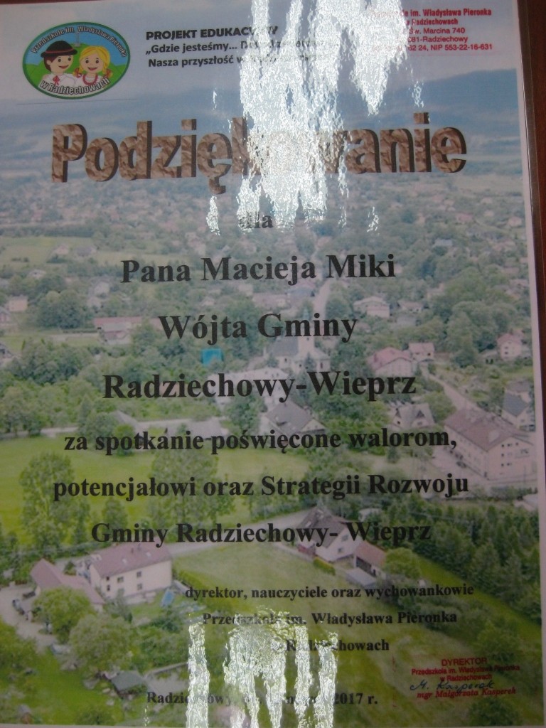 Serdecznie dziękujemy Panu Wójtowi za spotkanie poświęcone walorom oraz potencjałowi naszej małej ojczyzny. Jednocześnie życzymy wytrwałości i powodzenia w realizacji założeń „Programu rozwoju Gminy Radziechowy- Wieprz”.