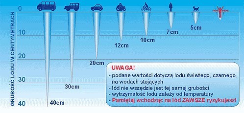 Aby lód wytrzymał ciężar dorosłej osoby jego pokrywa musi mieć grubość przynajmniej 7 cm. Do jego grubości nie wolno wliczać tak zwanego lodu mętnego, lodu pośniegowego, czyli świeżej warstwy na wierzchu a więc takiej, jaka wytworzy się najprawdopodobniej w najbliższych dniach. Grubość min. 7 cm lód może osiągnąć dopiero po wielu dniach z rzędu, w których temperatura również za dnia utrzymuje się poniżej – 10 st. C.