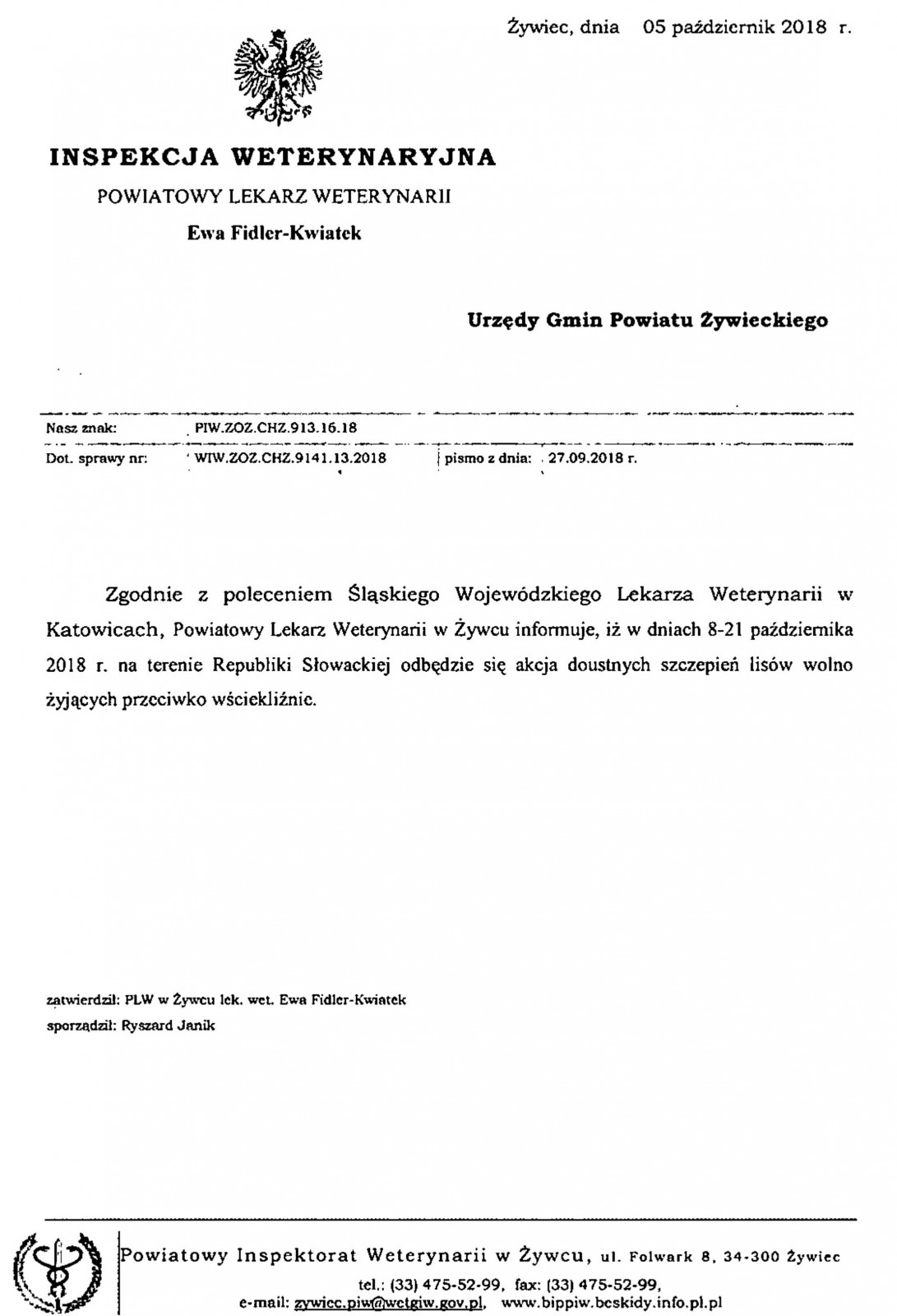 Powiatowy Lekarz Weterynarii w Żywcu informuje, iż w dniach 8-21 października 2018r. na terenie Republiki Słowackiej odbędzie się akcja doustnych szczepień lisów wolno żyjących przeciwko wściekliźnie.