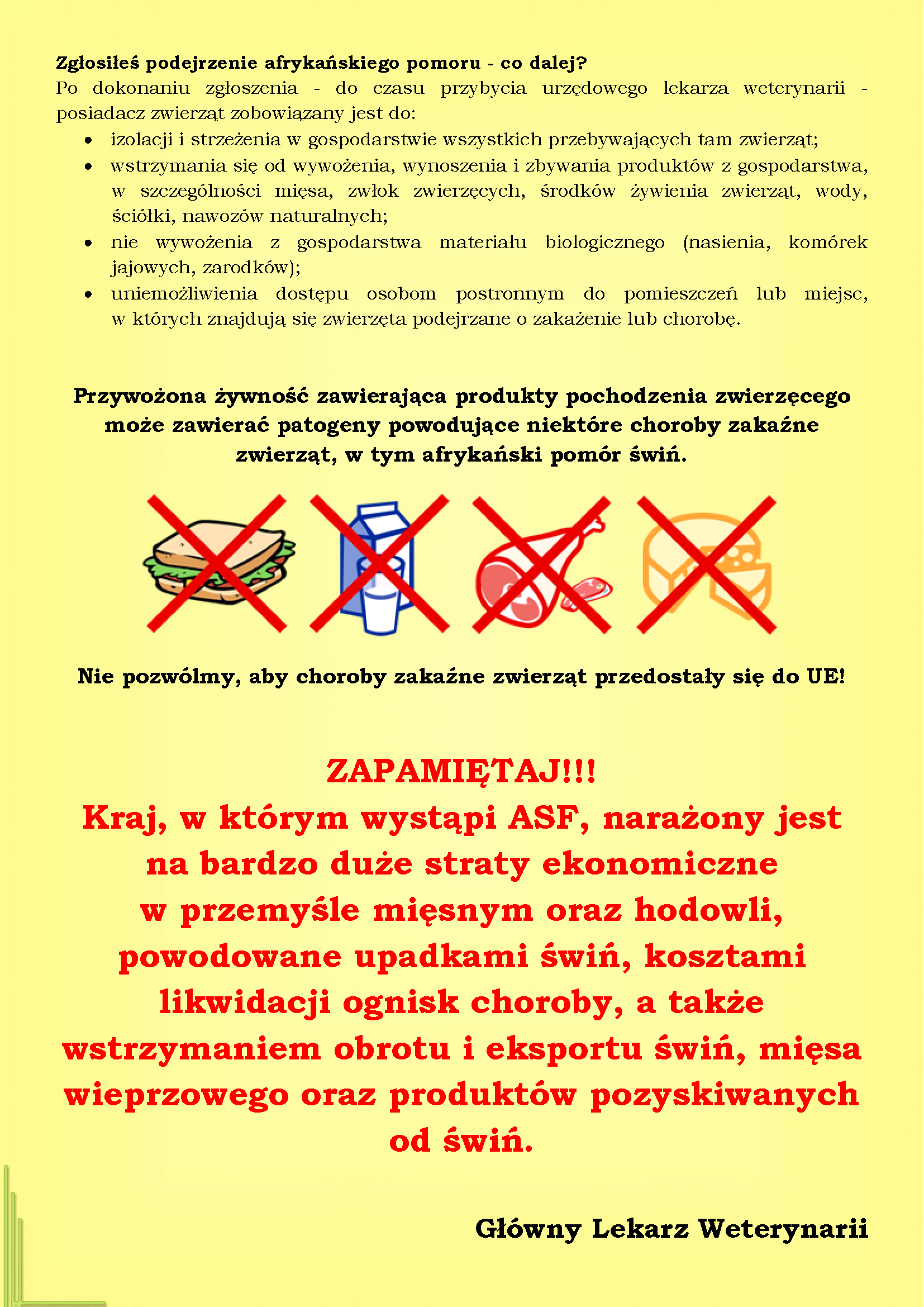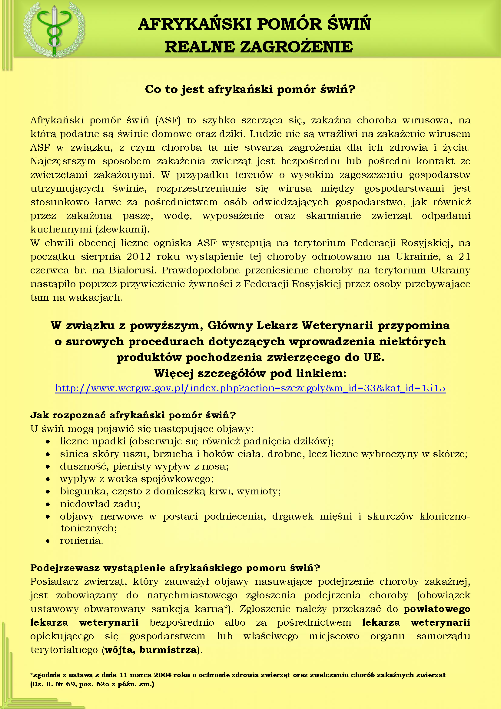 Afrykański pomór świń (ASF) to szybko szerząca się, zakaźna choroba wirusowa, na którą podatne są świnie domowe oraz dziki. Ludzie nie są wrażliwi na zakażenie wirusem ASF w związku, z czym choroba ta nie stwarza zagrożenia dla ich zdrowia i życia. Najczęstszym sposobem zakażenia zwierząt jest bezpośredni lub pośredni kontakt ze zwierzętami zakażonymi. W przypadku terenów o wysokim zagęszczeniu gospodarstw utrzymujących świnie, rozprzestrzenianie się wirusa między gospodarstwami jest stosunkowo łatwe za pośrednictwem osób odwiedzających gospodarstwo, jak również przez zakażoną paszę, wodę, wyposażenie oraz skarmianie zwierząt odpadami kuchennymi (zlewkami).