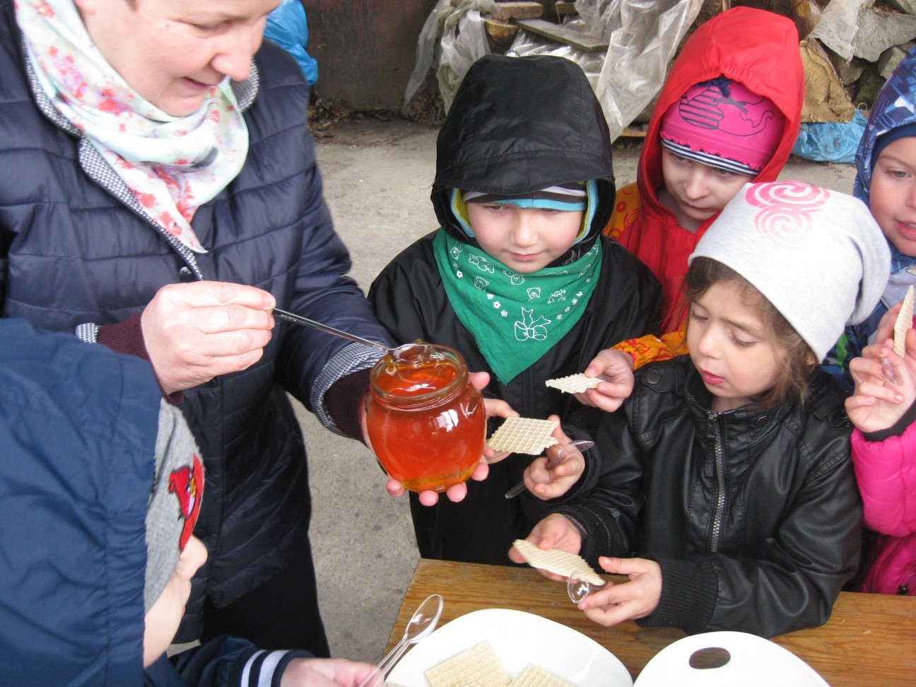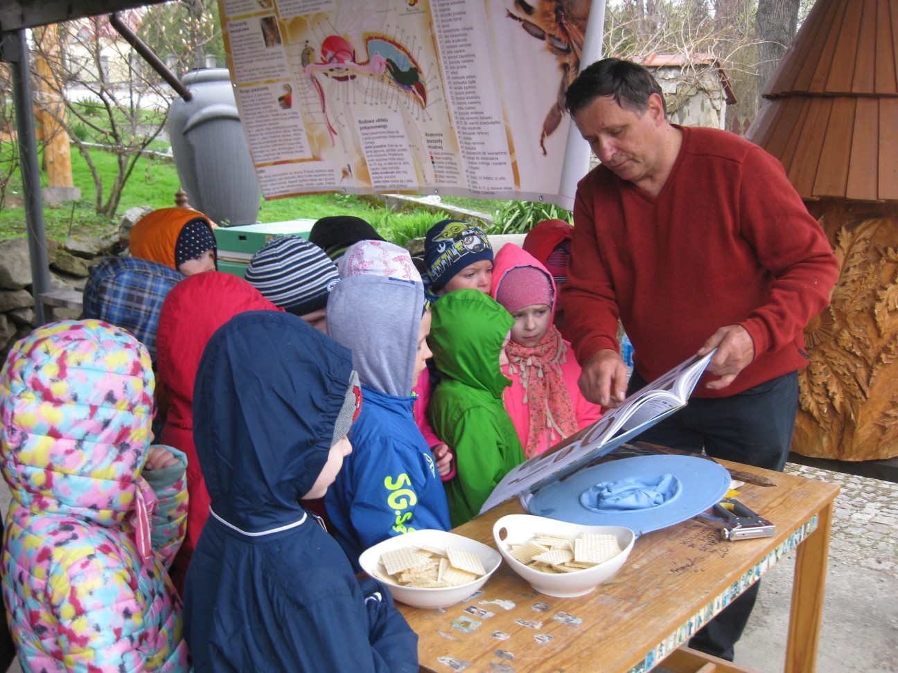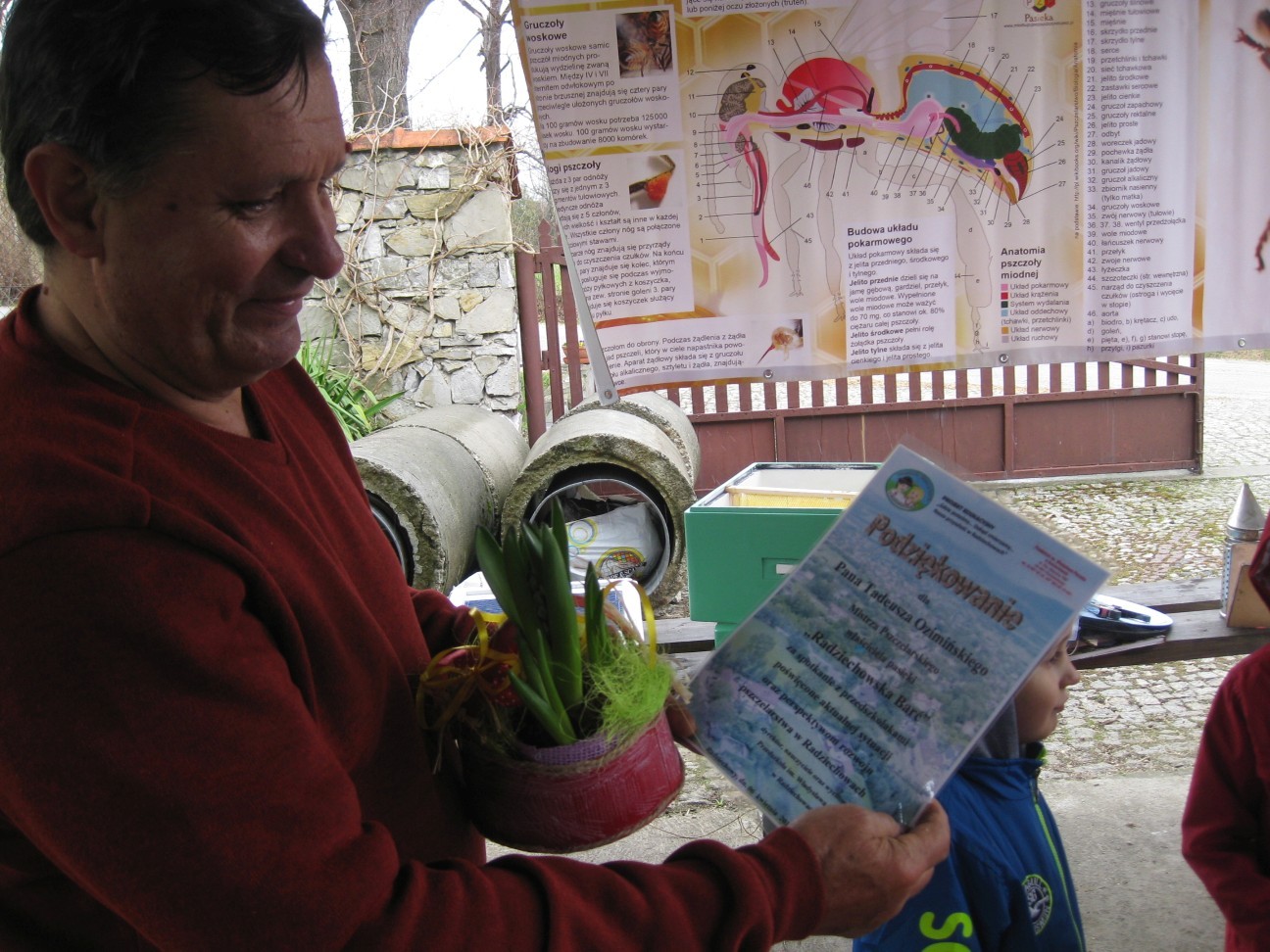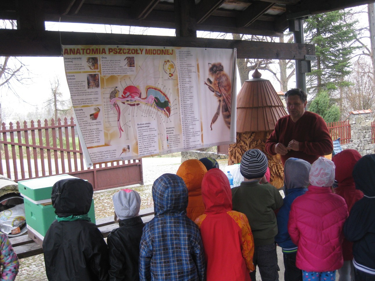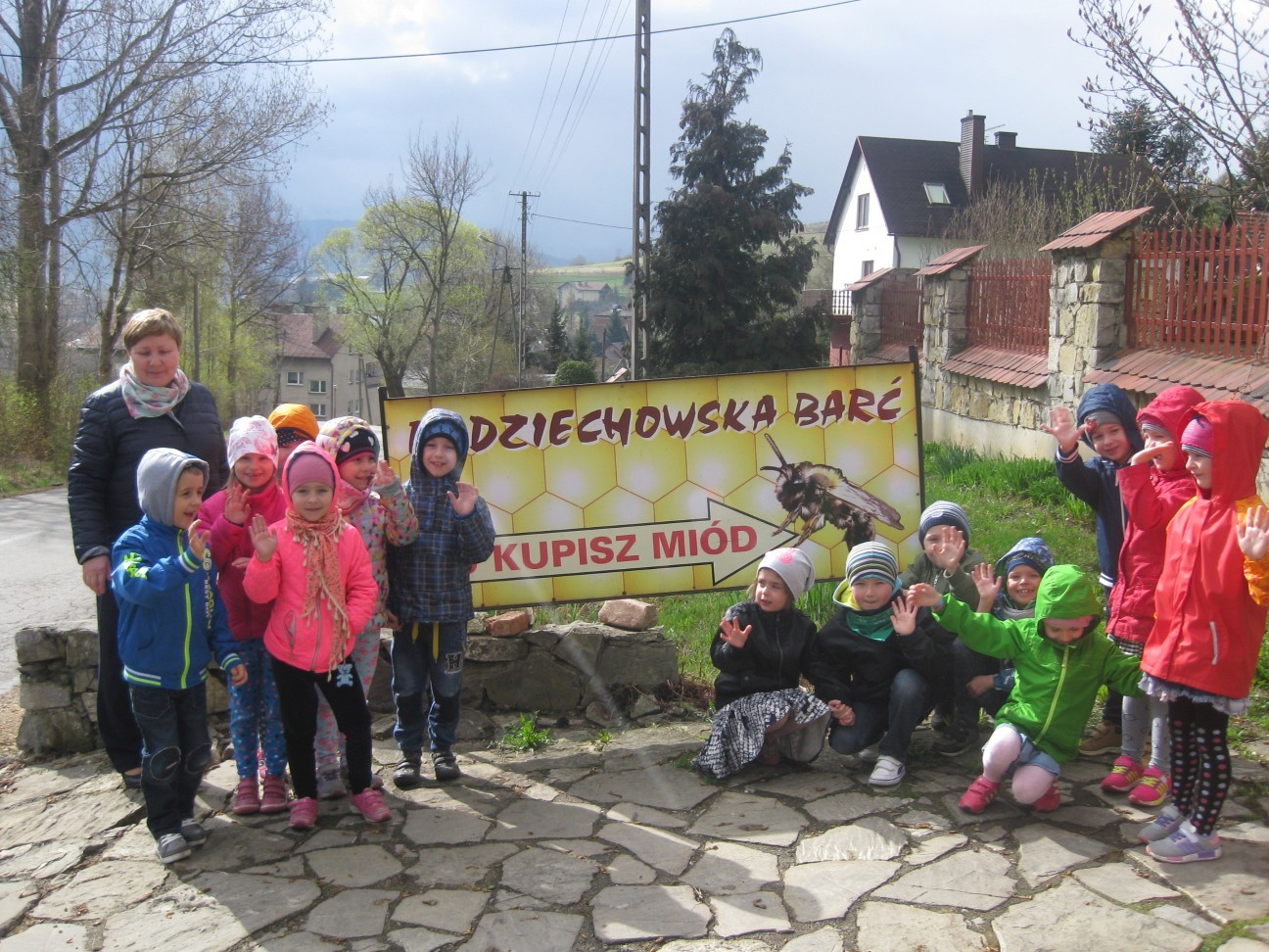 Poszukiwania informacji na temat wykorzystania w przyszłości potencjału przyrodniczego i turystycznego zaprowadziły nas tym razem do pasieki Państwa Ozimińskich „Radziechowska Barć”. Mistrz pszczelarski Pan Tadeusz Ozimiński przygotował dla przedszkolaków profesjonalne zajęcia edukacyjne na temat historii pszczelarstwa i jego obecnej sytuacji w kraju i na świecie. Mało kto z nas wiedział, że pszczoły istniały na Ziemi już w czasach dinozaurów. Fascynująca organizacja umożliwiła tej owadziej społeczności przetrwanie przez setki milionów lat. Jednakże obecnie największym zagrożeniem dla świata pszczół i wszelkich wartości płynących z ich istnienia jest niestety człowiek i tworzona przez niego cywilizacja. Są kraje, gdzie zagłada owadów doprowadziła do tego, że ludzie muszą pędzelkami zapylać drzewa owocowe! Na szczęście są podejmowane działania ratunkowe. Wymaga to wiedzy i pasji wielu ludzi, jak również wzrostu ogólnej świadomości społeczeństwa na temat zagrożeń. To nasi wychowankowie w przyszłości będą podejmowali decyzje, mające wpływ na stan środowiska naturalnego. Przedszkolaki miały okazję obejrzeć nowocześnie zorganizowane przedsiębiorstwo pszczelarskie i porównać jego rozwój z informacjami historycznymi. Państwo Ozimińscy zadbali o ocalenie od zapomnienia uli, których wiek sięga często stu lat. Podsumowaniem warsztatów pszczelarskich dla przedszkolaków była wspólna konsumpcja miodu i pyłku pszczelego z Radziechowskiej Barci. Dziękujemy Panu Tadeuszowi Ozimińskiemu za wartościowe spotkanie i pozostaje nam mieć nadzieję, że zdobyta przez naszych przedszkolaków wiedza przyczyni się w przyszłości do przetrwania i rozwoju pszczelarstwa w naszej małej ojczyźnie. Pozwólmy pszczołom zapylać rośliny i wytwarzać miód.
