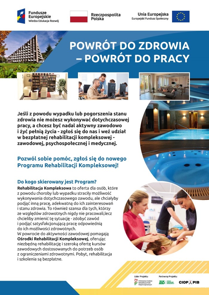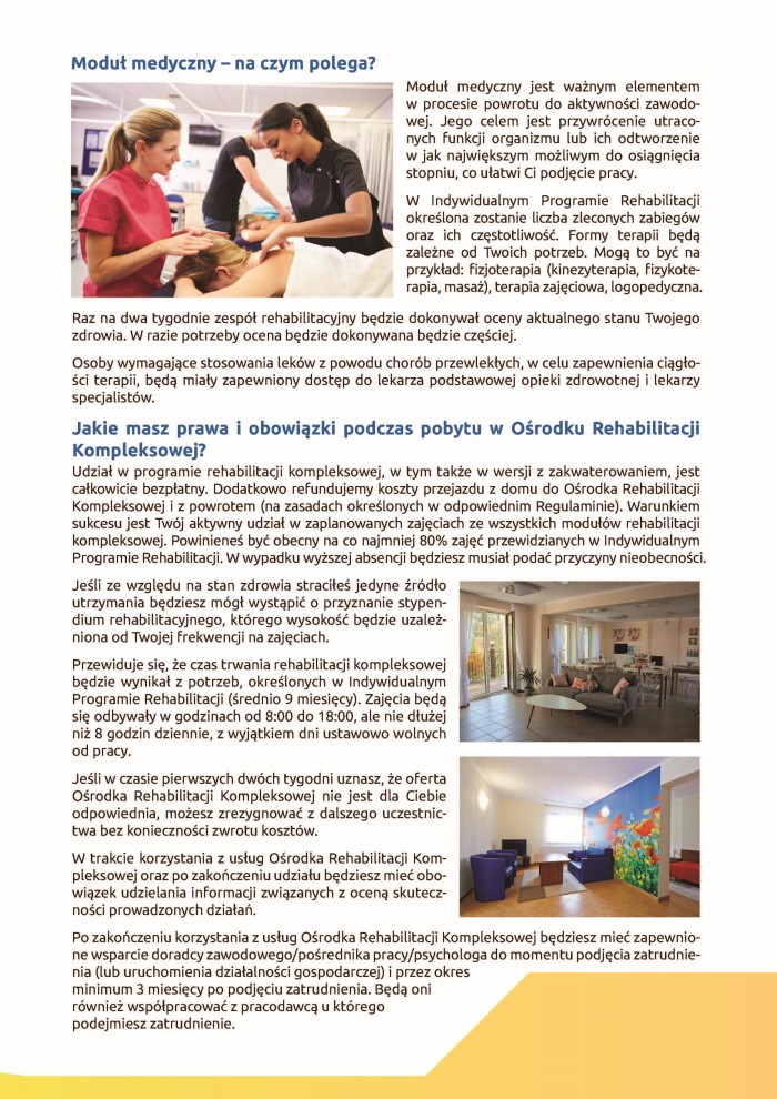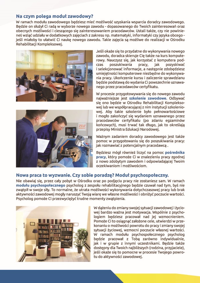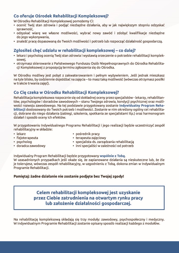 W powrocie do aktywności zawodowej pomagają Ośrodki Rehabilitacji Kompleksowej, oferując niezbędną rehabilitację i szeroką ofertę kursów zawodowych dostosowanych do potrzeb osób z ograniczeniami zdrowotnymi. Pobyt, rehabilitacja i szkolenia w takim Ośrodku są bezpłatne.