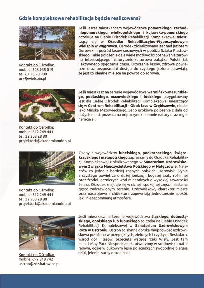 Zakres i formy prowadzonych działań rehabilitacji kompleksowej będzie ustalany indywidualnie dla każdego uczestnika programu, przy jego czynnym udziale i dostosowany do jego indywidualnych potrzeb i możliwości. W procesie aktywizacji zawodowej szczególny akcent zostanie położony na stawianie realnych celów dotyczących podjęcia albo powrotu aktywności zawodowej.