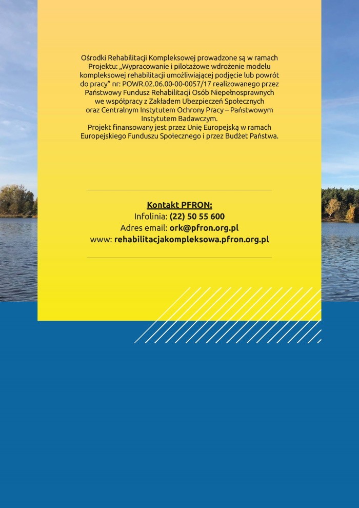 Ośrodki Rehabilitacji Kompleksowej prowadzone są w ramach Projektu: „Wypracowanie i pilotażowe wdrożenie modelu kompleksowej rehabilitacji umożliwiającej podjęcie lub powrót do pracy” realizowanego przez Państwowy Fundusz Rehabilitacji Osób Niepełnosprawnych we współpracy z Zakładem Ubezpieczeń Społecznych oraz Centralnym Instytutem Ochrony Pracy – Państwowym Instytutem Badawczym. Projekt finansowany jest przez Unię Europejską w ramach Europejskiego Funduszu Społecznego i przez Budżet Państw