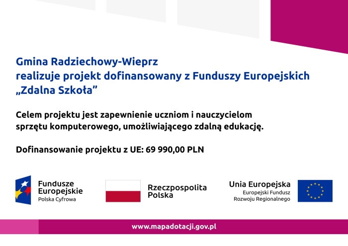 Gmina Radziechowy-Wieprz otrzymała grant w wysokości 69 990,00 zł w ramach projektu „Zdalna Szkoła”, ogłoszonego przez Centrum Projektów Polska Cyfrowa. Głównym kryterium podziału środków była liczba uczniów w szkołach prowadzonych przez daną jednostkę samorządu terytorialnego.