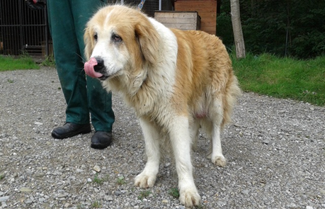 Duża, spokojna suczka, mieszaniec bernardyna, biało-brązowa. Znaleziona w Juszczynie 14.08.2014.