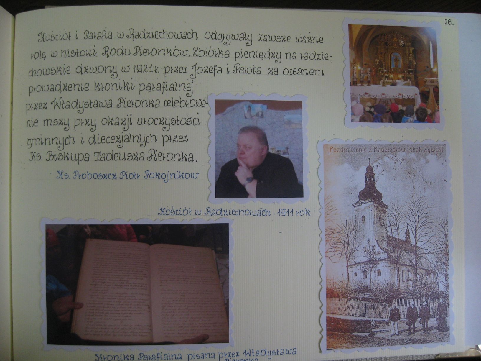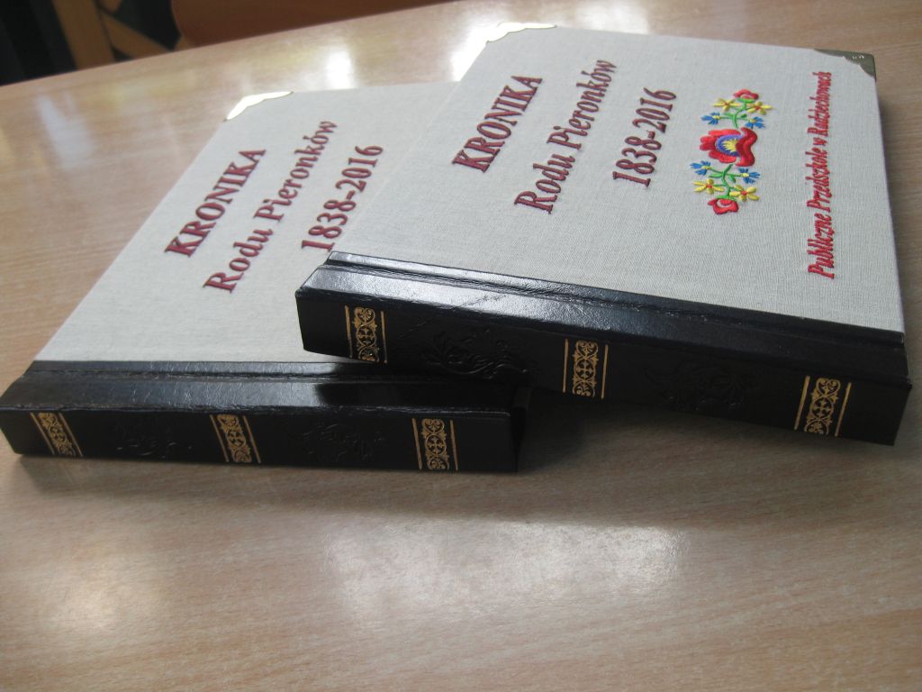- Jednym z trwałych efektów realizacji projektu jest stworzenie kroniki, która została wręczona przedstawicielom rodu Pieronków podczas spotkania z przedszkolakami 20 maja 2016r. Stworzenie kroniki możliwe było dzięki zespołowej pracy nauczycieli i wychowanków Publicznego Przedszkola w Radziechowach oraz dzięki materiałom historycznym udostępnionym przez braci Mieczysława Pieronka i Księdza Biskupa Tadeusza Pieronka. W zebraniu informacji pomocne były też organizacje i instytucje współpracujące z przedszkolem: Oddział Górali Żywieckich Związku Podhalan, Koło Gospodyń Wiejskich, Parafia w Radziechowach oraz Ochotnicza Straż Pożarna w Radziechowach. Za obróbkę zdjęć i redagowanie tekstów odpowiedzialny był zespół w składzie: dyrektor Małgorzata Kasperek oraz nauczycielki: Mirosława Szala, Alicja Kąkol, Katarzyna Jakubiec, Renata Dziergas, Magdalena Brodka i Aleksandra Kania. Wszystkie teksty i zdobienia graficzne wykonała ręcznie nauczycielka Krystyna Tlałka. Prace plastyczne zostały wykonane przez dzieci pod kierunkiem nauczycielek Justyny Migdał Kasperek, Mirosławy Szali, Jadwigi Howaniec i Krystyny Tlałki. Piękny haft na stronie tytułowej wykonali: Marek Jurasz (Prezes Stowarzyszenia Społeczno-Kulturalnego "Grojcowianie") oraz Henryk Martyniak (właściciel firmy Hebomar). Powstały trzy bliźniacze egzemplarze kroniki.