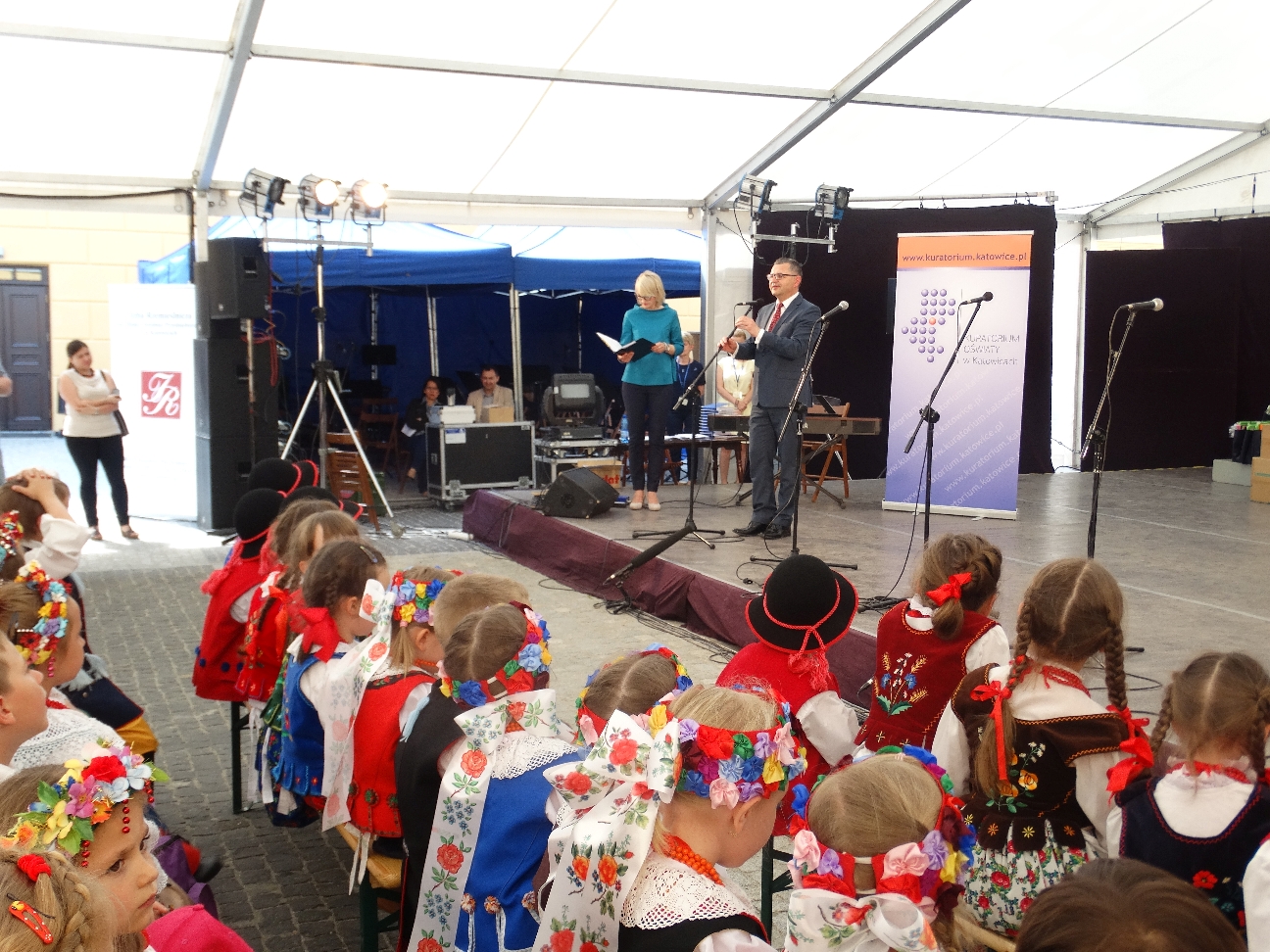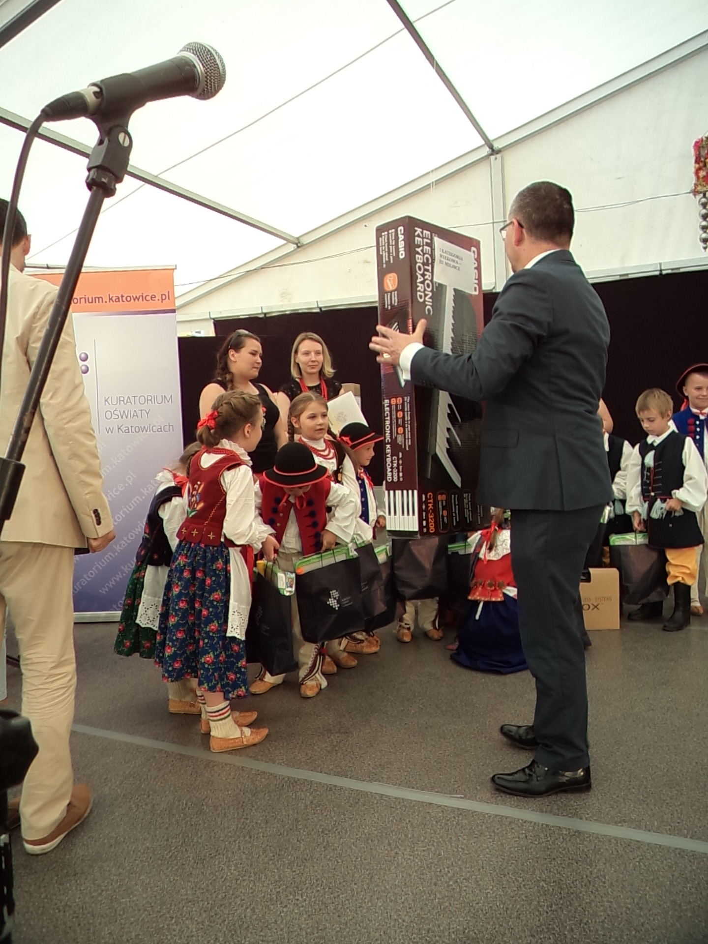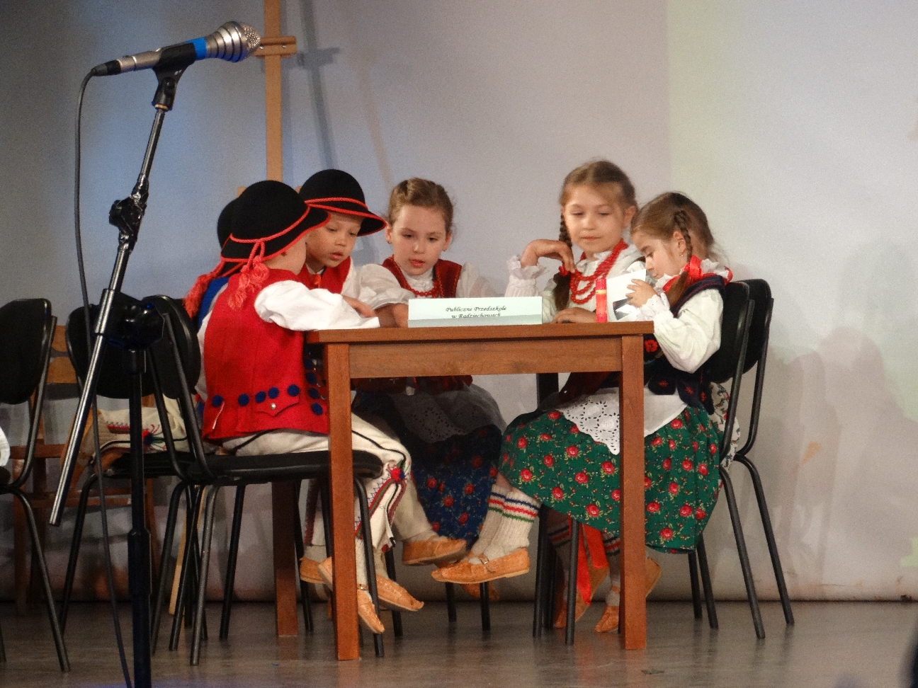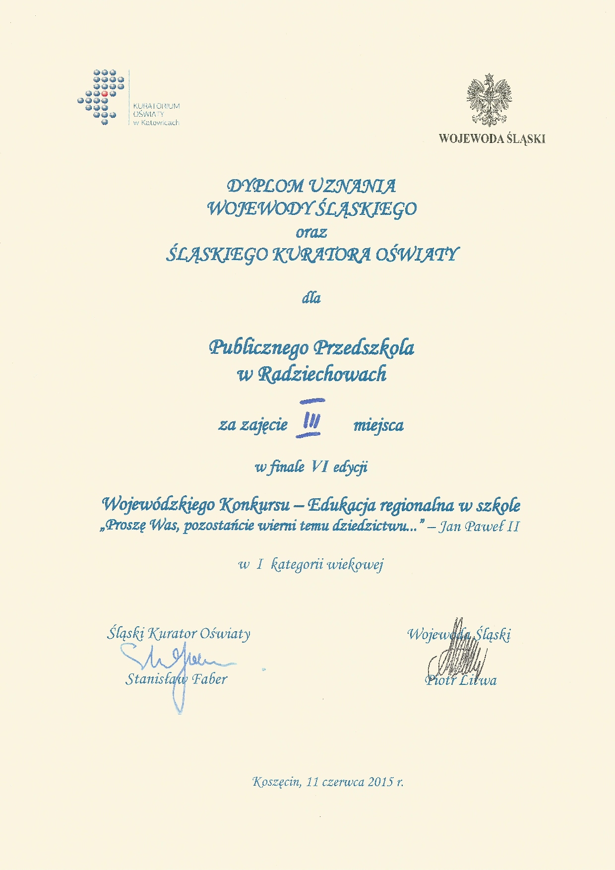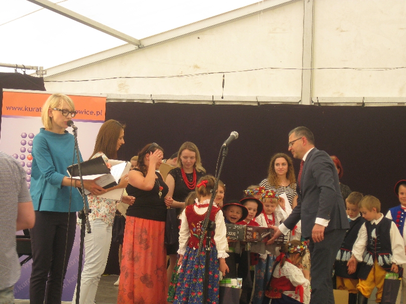 Finał odbył się w ramach Święta Edukacji Regionalnej organizowanego corocznie w siedzibie Zespołu Pieśni i Tańca Śląsk w Koszęcinie. Podczas potyczek dzieci wspierali ich rodzice, wychowawczynie (Aleksandra Kania i Mirosława Szala), kapela Zespołu Grojcowanie w składzie: pani Brygida Murańska, Nina Grzegorek i Kacper Murański, pani Elżbieta Kosiec- Dyrektor GZO Radziechowy- Wieprz, pani Irena Rodak Przewodnicząca Komisji Oświaty Rady Gminy, pani Marta Husar z Gminnego Centrum Kultury, Promocji i Turystyki oraz pani Małgorzata Kasperek –dyrektor Publicznego Przedszkola w Radziechowach. Nasze przedszkolaki godnie reprezentowały Publiczne Przedszkole w Radziechowach dzielnie potykając się z najlepszymi w województwie placówkami. Zaprezentowały piosenkę z tematyce przyrodniczej „Góry, nasze góry” oraz scenkę rodzajową na temat zmian w krajobrazie naszej okolicy pt.”Przy wykopkach”. Teksty obydwu tych utworów ułożyła specjalnie na tę okazję pani Brygida Murańska, która wraz z wychowawczyniami przygotowywała dzieci do występu wielokrotnie odwiedzając nasze przedszkole. Dzieci rozwiązywały też zadania na temat przyrody i zabytków województwa śląskiego. Wszystkie przedszkola biorące udział w finale prezentowały bardzo wysoki poziom wykonania poszczególnych zadań. Mimo tak dużej konkurencji, zmęczenia przedszkolaków ponad 3-godzinną podróżą do Koszęcina, stresu wywołanego nowym otoczeniem i szeroką widownią występ reprezentacji Publicznego Przedszkola w Radziechowach został wysoko oceniony przez wojewódzką komisję konkursową. Biorąc pod uwagę całokształt działań konkursowych Publiczne Przedszkole w Radziechowach zajęło III miejsce w województwie śląskim. Przypominamy, że udział dzieci w finale poprzedziły półroczne wieloetapowe zmagania wielu placówek województwa śląskiego. Oceniana była wieloletnia działalność szkół i przedszkoli w zakresie edukacji regionalnej. W kolejnym etapie zwycięskie placówki opracowywały i realizowały projekty edukacyjne na temat zmian w krajobrazie okolicy. I w ten o to sposób z kilkuset zakwalifikowanych do konkursu szkół i przedszkoli wybrano 15 najlepszych (5 przedszkoli, 5 szkół podstawowych i 5 gimnazjów i szkół ponadgimnazjalnych). Śląski Kurator Oświaty Stanisław Faber wręczył wszystkim finalistom nagrody indywidualne oraz nagrody dla szkół, które zaangażowane były w działania konkursowe i dotarły do finału. Publiczne Przedszkole w Radziechowach otrzymało keyboard elektroniczny, który z pewnością bardzo się przyda podczas zajęć z rytmiki, które realizowane będą od września nowego roku szkolnego. Szczególnie cenną nagrodą dla wszystkich finalistów konkursu, a zarazem podsumowaniem Święta Edukacji Regionalnej był przepiękny koncert edukacyjny w wykonaniu Zespołu Pieśni i Tańca "Śląsk". Całość przedstawienia z orkiestrą, chórem i tańcem to lekcja, w której udział jest wyjątkowym wyróżnieniem dla naszych przedszkolaków i ich wychowawczyń. Serdecznie gratulujemy dzieciom, wszystkim nauczycielkom zaangażowanym w realizację działań konkursowych na wszystkich jego etapach, Grojcowianom z panią Brygidą Murańską na czele, instytucjom radziechowskim i osobom prywatnym wspierającym przedszkole. Szczególne podziękowania składamy rodzicom naszych przedszkolaków, którzy swoją postawą i wsparciem przyczynili się do sukcesu Publicznego Przedszkola w Radziechowach. Jesteśmy, proszę Państwa w ścisłej czołówce najlepszych placówek oświatowych naszego województwa. Zapraszamy do fotogalerii z finału oraz na stronę Kuratorium Oświaty w Katowicach, gdzie szerzej opisano Święto Edukacji Regionalnej w Koszęcinie: http://www.kuratorium.katowice.pl/?page=EventPage&eventId=561