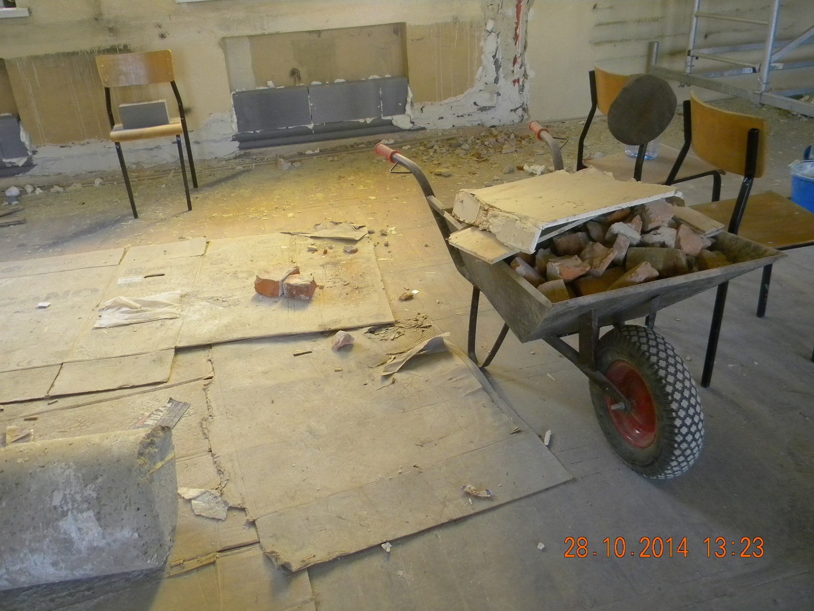 - Wszystko to po, aby sala wyglądała tak, jak ma wyglądać – mówi Pani Sołtys Janina Tlałka. Remont rozpoczął się od finansowanych z funduszu sołeckiego nagrzewnic, które miały usprawnić system ogrzewania i skutecznie utrzymywały ciepło w sali. To jednak nie zaspokoiło potrzeb i oczekiwań mieszkańców. Stowarzyszenia działające na terenie gminy postanowiły wykorzystać moment, w którym sala jest wyłączona z użytkowania i przeprowadzić gruntowny remont sali. - Udało nam się uzyskać od sołectwa 25 tysięcy zostały zrobione nadmuchy, zostały umieszczone tak, aby w prosty i szybki sposób można było nagrzać salę. PO czym stwierdzono, że taki remont nie wystarczy. – komentuje Pan Tomasz Kania, prezes stowarzyszenia Zespołu Pieśni i Tańca „Jodełki” - Doszło do rozebrania zużytego parkietu i zdemontowania sceny, które zostały czynem społecznym także wywiezione. Odkryte stare wylewki zostały skute.
