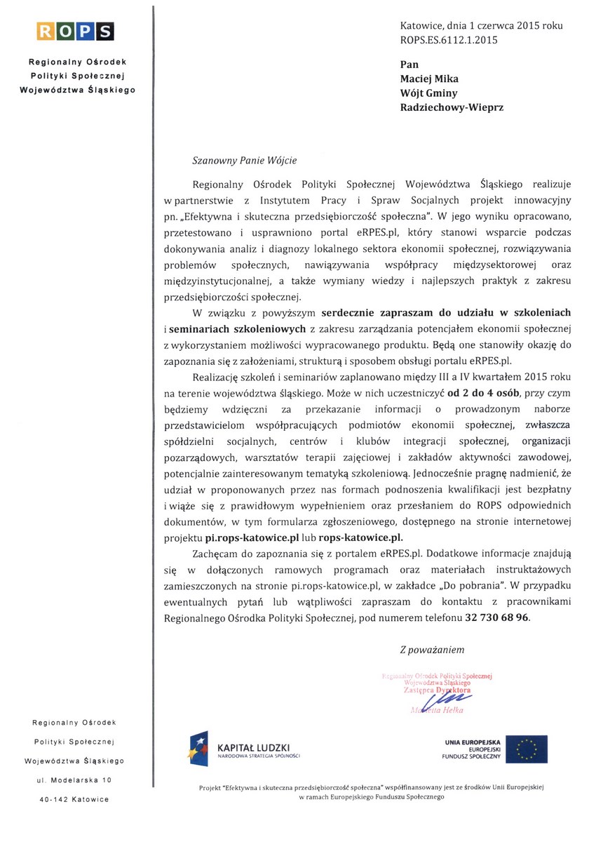 Zachęcam do zapoznania się z portalem eRPES.pl. Dodatkowe informacje znajdują się w dołączonych ramowych programach oraz materiałach instruktażowych zamieszczonych na stronie pi.rops-katowice.pl, w zakładce „Do pobrania". W przypadku ewentualnych pytań lub wątpliwości zapraszam do kontaktu z pracownikami Regionalnego Ośrodka Polityki Społecznej, pod numerem telefonu 32 730 68 96.