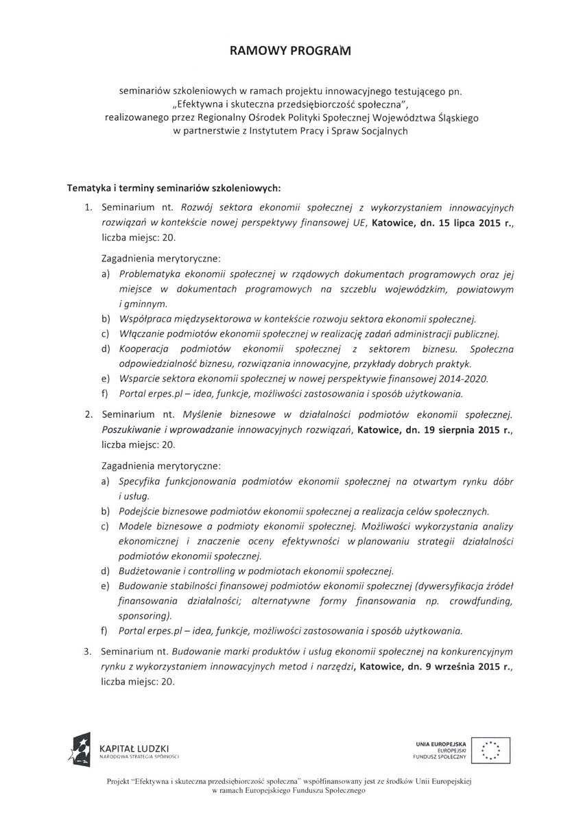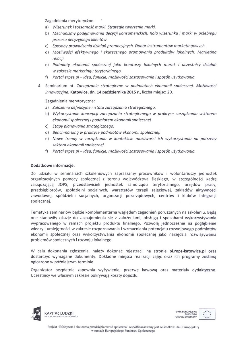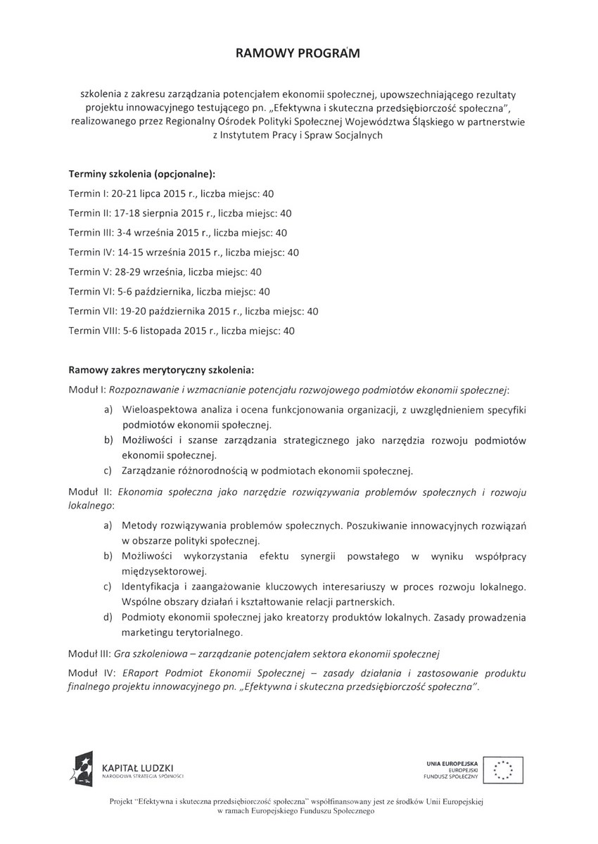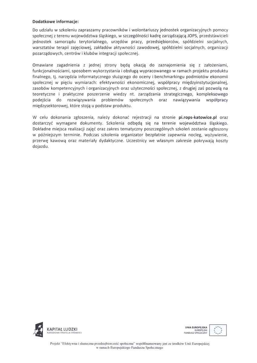Realizację szkoleń i seminariów zaplanowano między III a IV kwartałem 2015 roku na terenie województwa śląskiego. Może w nich uczestniczyć od 2 do 4 osób, przy czym będziemy wdzięczni za przekazanie informacji o prowadzonym naborze przedstawicielom współpracujących podmiotów ekonomii społecznej, zwłaszcza spółdzielni socjalnych, centrów i klubów integracji społecznej, organizacji pozarządowych, warsztatów terapii zajęciowej i zakładów aktywności zawodowej, potencjalnie zainteresowanym tematyką szkoleniową. Jednocześnie pragnę nadmienić, że udział w proponowanych przez nas formach podnoszenia kwalifikacji jest bezpłatny i wiąże się z prawidłowym wypełnieniem oraz przesłaniem do ROPS odpowiednich dokumentów, w tym formularza zgłoszeniowego, dostępnego na stronie internetowej projektu pi.rops-katowice.pl lub rops-katowice.pl.