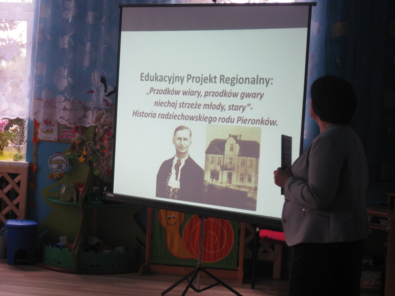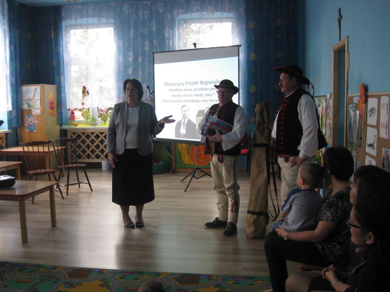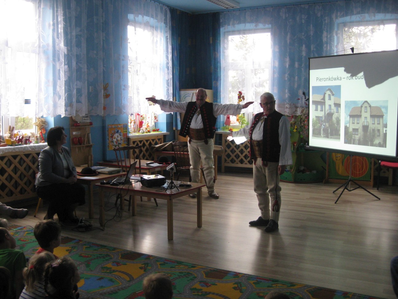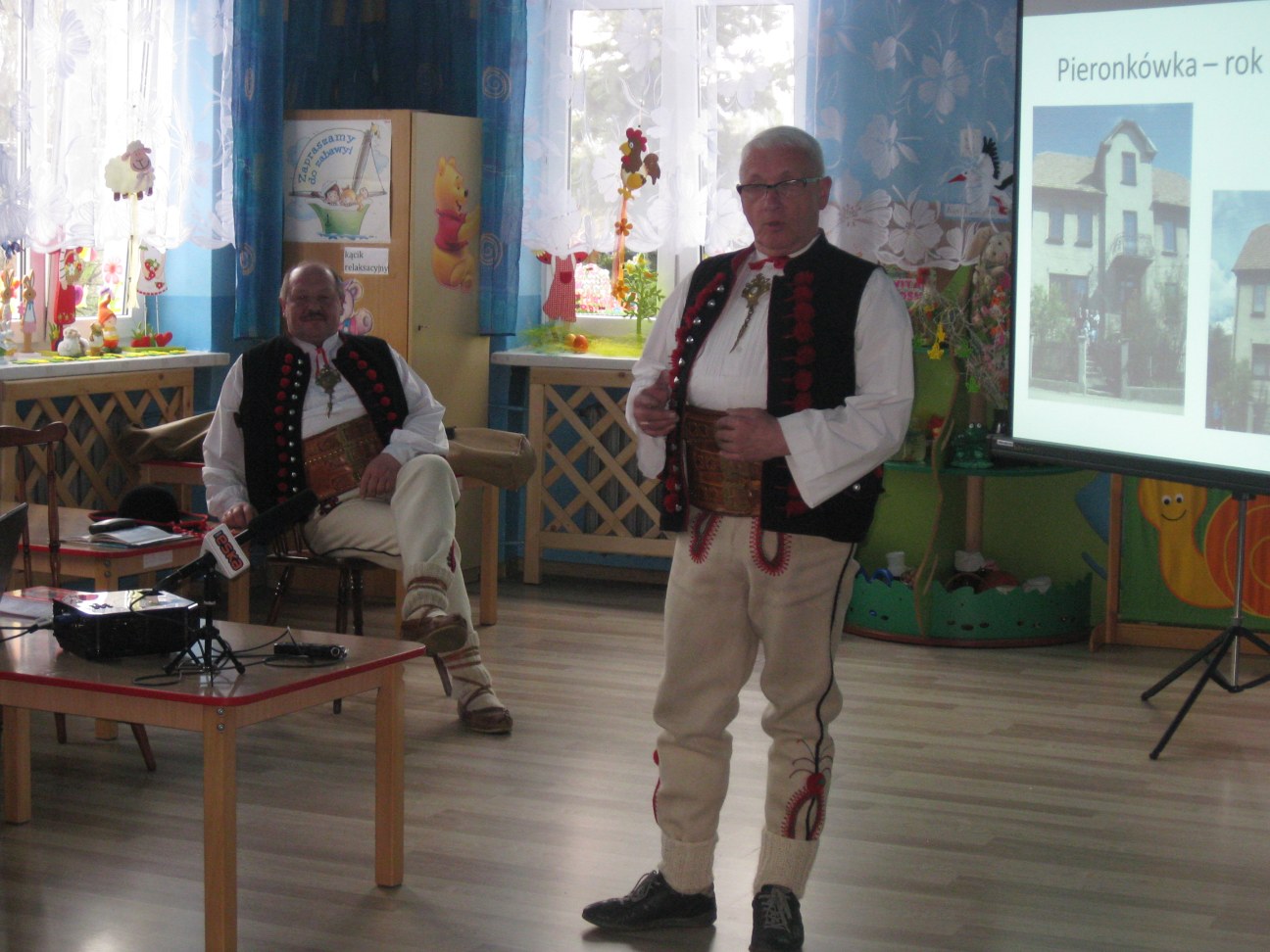 Głównym celem wizyty w przedszkolu obydwu Panów było przybliżenie społeczności przedszkolnej postaci Władysława Pieronka w kontekście jego zasług dla Związku Podhalan i pielęgnowania tradycji góralskich. Pan Władysław Motyka (odznaczony w ostatnim czasie Krzyżem Kawalerskim Orderu Odrodzenia Polski) piękną góralską gwarą opowiedział o potrzebie pielęgnowania tradycji regionalnych, odnosząc się do stroju i zwyczajów górali żywieckich. To umiłowanie tradycji i rodzinnej miejscowości było główną motywacją dla dokonań Władysława Pieronka w latach międzywojennych i w późniejszym czasie: jeden z założycieli Związku Podhalan na Żywiecczyźnie, Związku Pracy Obywatelskiej Kobiet w Radziechowach (późniejsze Koło Gospodyń Wiejskich), naczelnik Ochotniczej Straży Pożarnej, wójt zbiorowej gminy Zabłocie (w skład której wchodziły: Zabłocie, Radziechowy, Leśna, Ostre, Słotwina i Sienna). Władysław Pieronek podjął szereg działań mających na celu promocję Radziechów jako miejscowości letniskowej o walorach turystycznych i uzdrowiskowych (zlecenie wykonania badań zalet mikroklimatu, wydawnictwo kartek pocztowych, sprowadzenie turnusów letników z Łodzi i organizacja dla nich wyżywienia i noclegów). Radziechowy znane były w okresie międzywojennym w całej Polsce. Właśnie tutaj z inicjatywy m.in. Władysława Pieronka powstał pierwszy w regionie basen kąpielowy. Wspomnieniem obszernej twórczości literackiej Władysława Pieronka (poezja, scenariusze przedstawień, wspomnienia i kroniki) było wspólne odśpiewanie hymnu Związku Podhalan na Żywiecczyźnie z czasów międzywojennych: