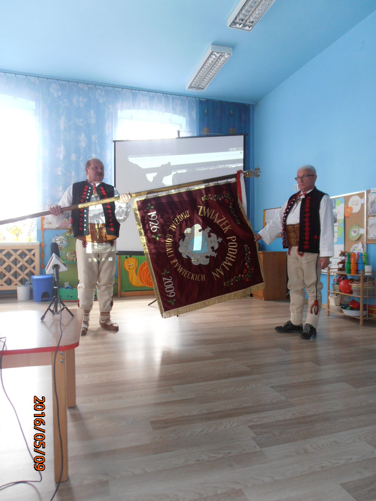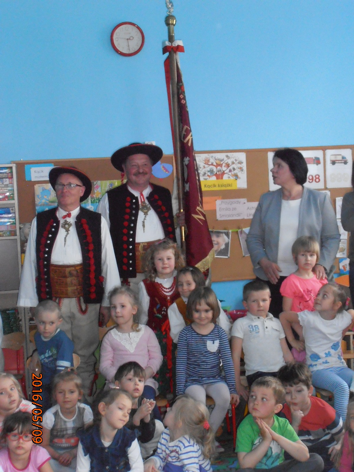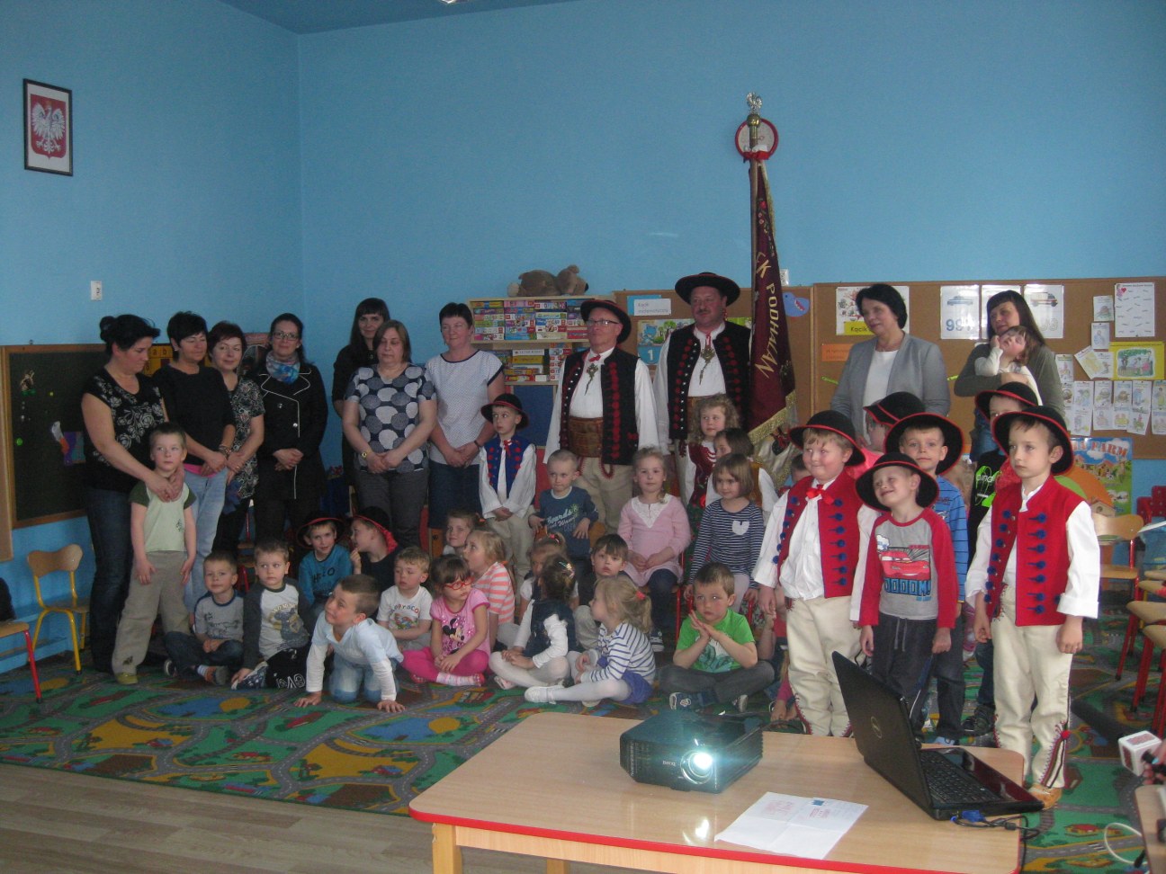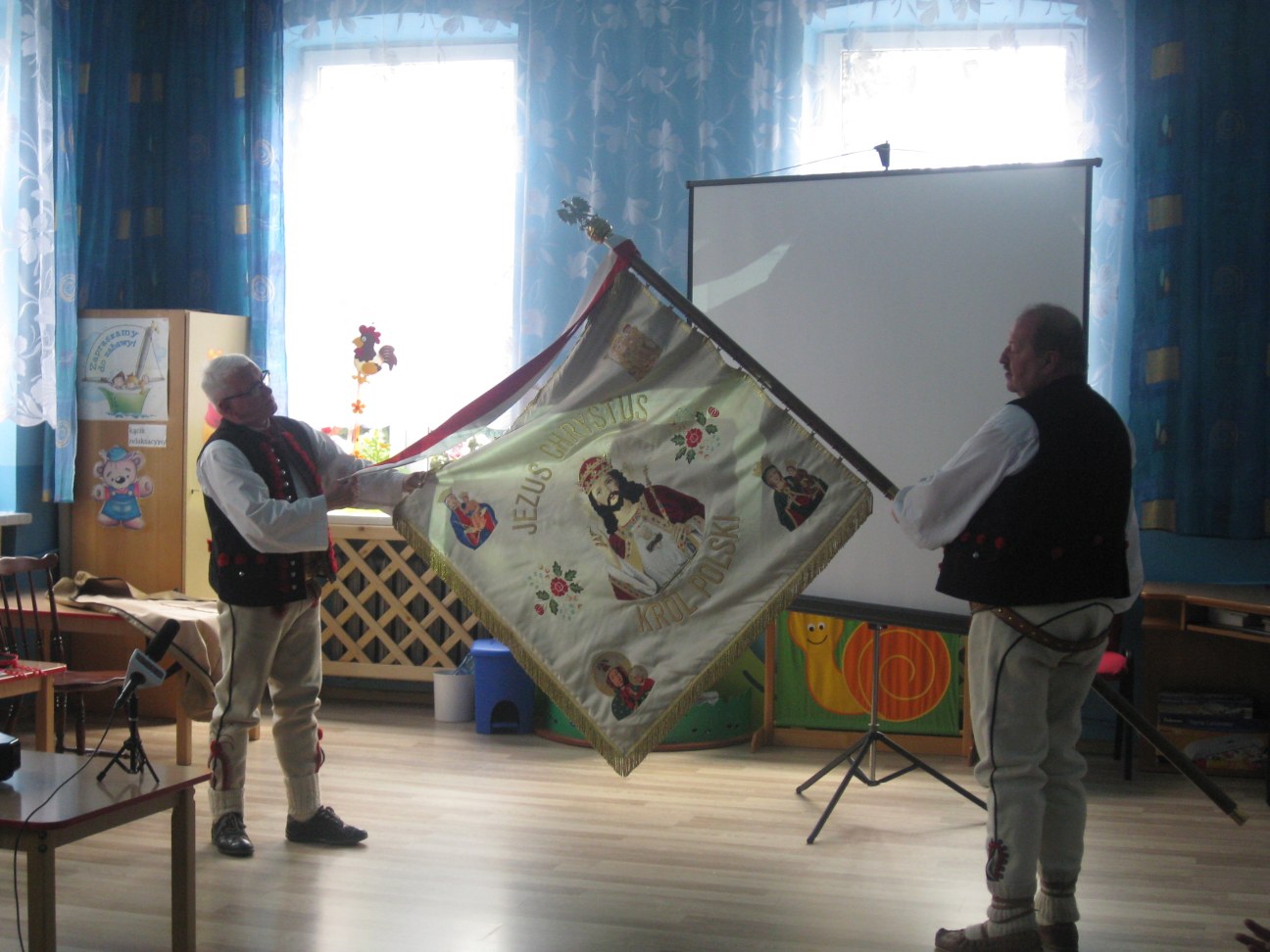 Pan Stanisław Lizak zaprezentował dzieciom tradycyjne elementy stroju góralskiego oraz jeden z trzech sztandarów Oddziału Górali Żywieckich Związku Podhalan. Na zakończenie spotkania zostało wykonane wspólne pamiątkowe zdjęcie wszystkich uczestników spotkania. Dziękujemy Panom Władysławowi Motyce i Stanisławowi Lizakowi za spotkanie, które wzbogaciło realizację projektu "Przodków wiary, przodków gwary niechaj strzeże młody, stary"- Historia radziechowskiego rodu Pieronków. Dziękujemy za udział w spotkaniu Rodzicom naszych przedszkolaków, Pani Marcie Husar z GCKPT Radziechowy- Wieprz oraz Pani Agacie Chmielowskiej z Radia ESKA Beskidy. Niebawem zostanie wyemitowana audycja radiowa relacjonująca wydarzenie.