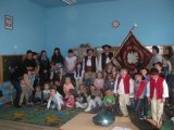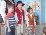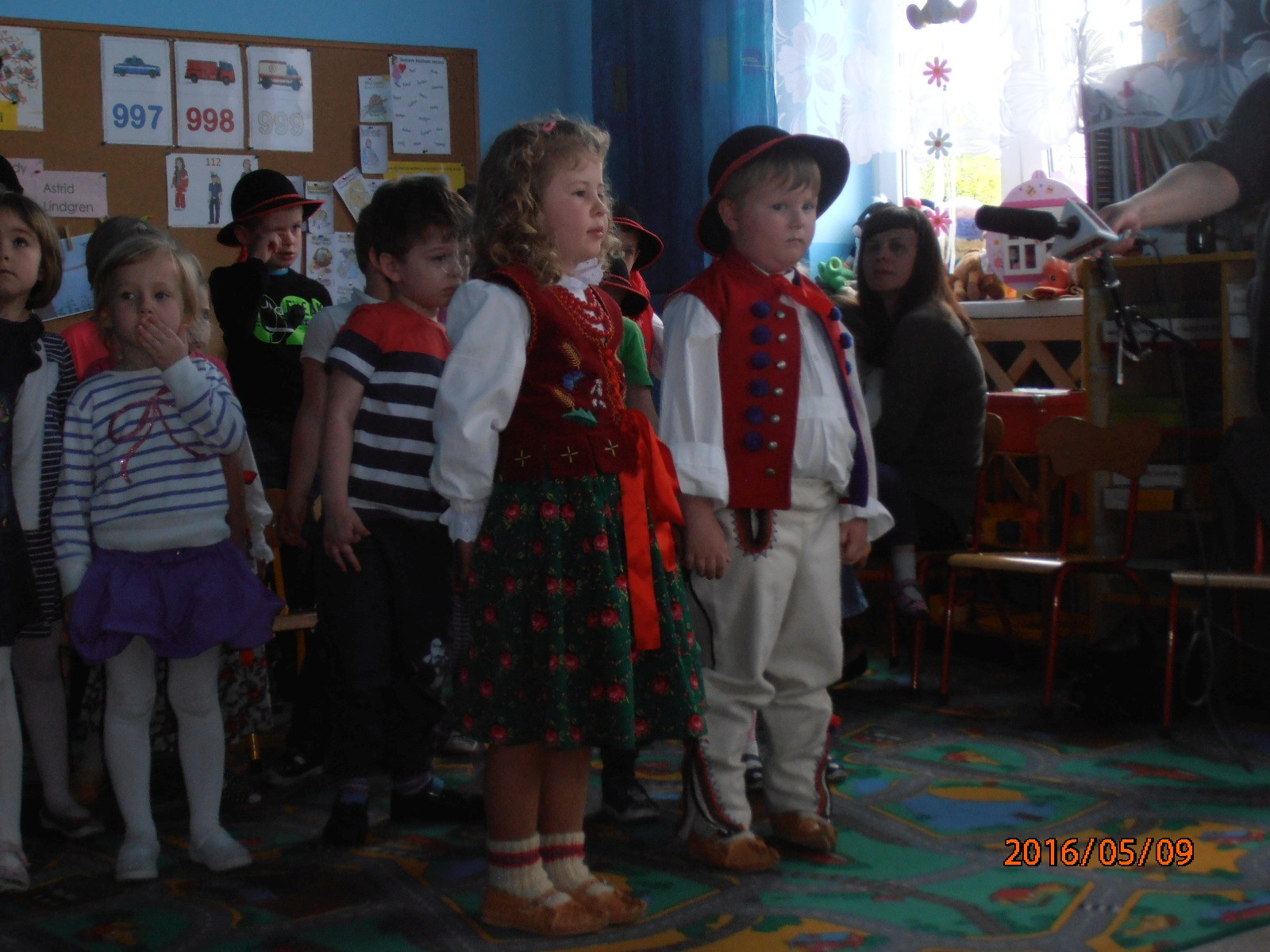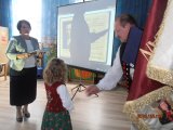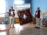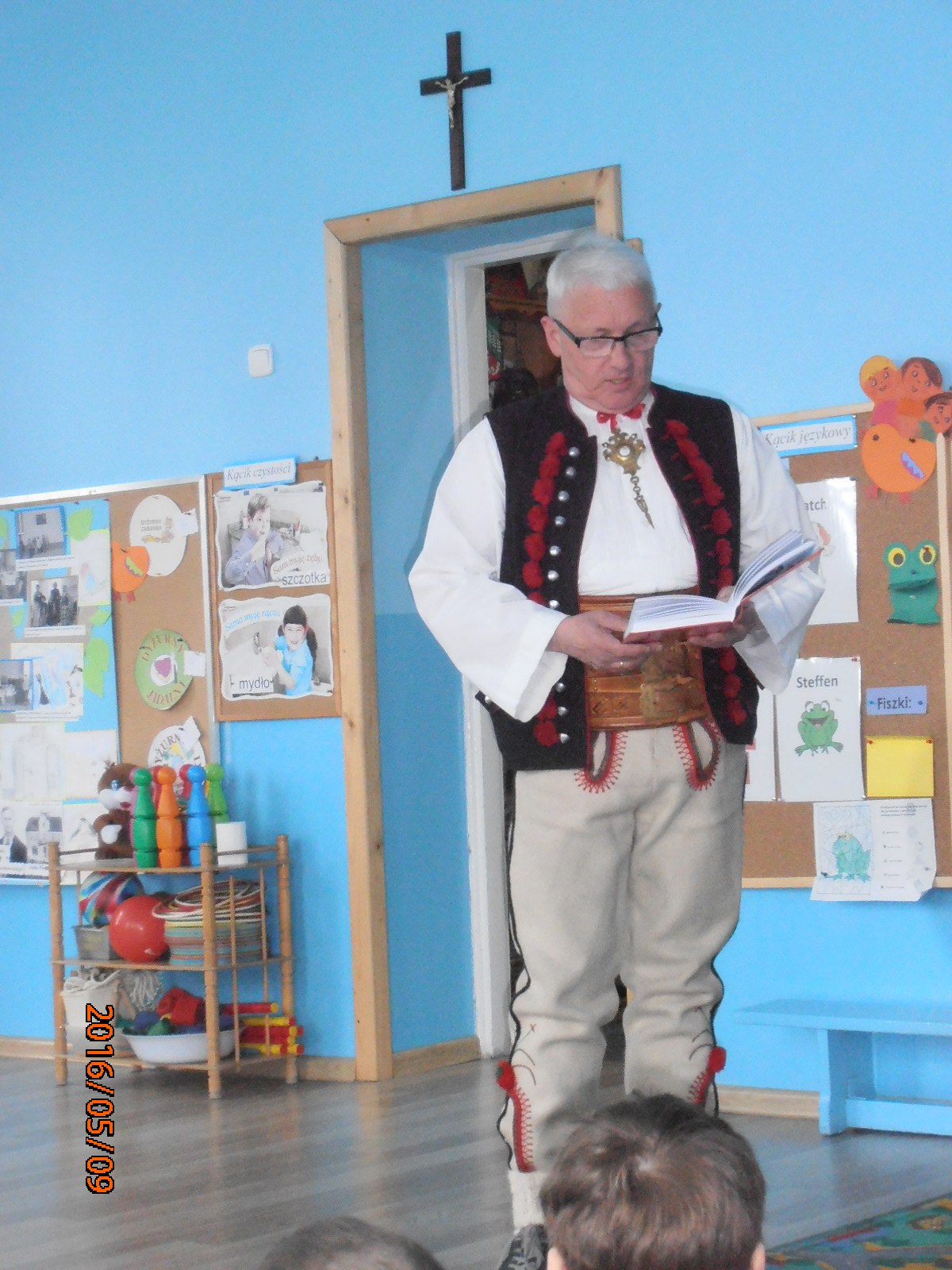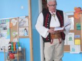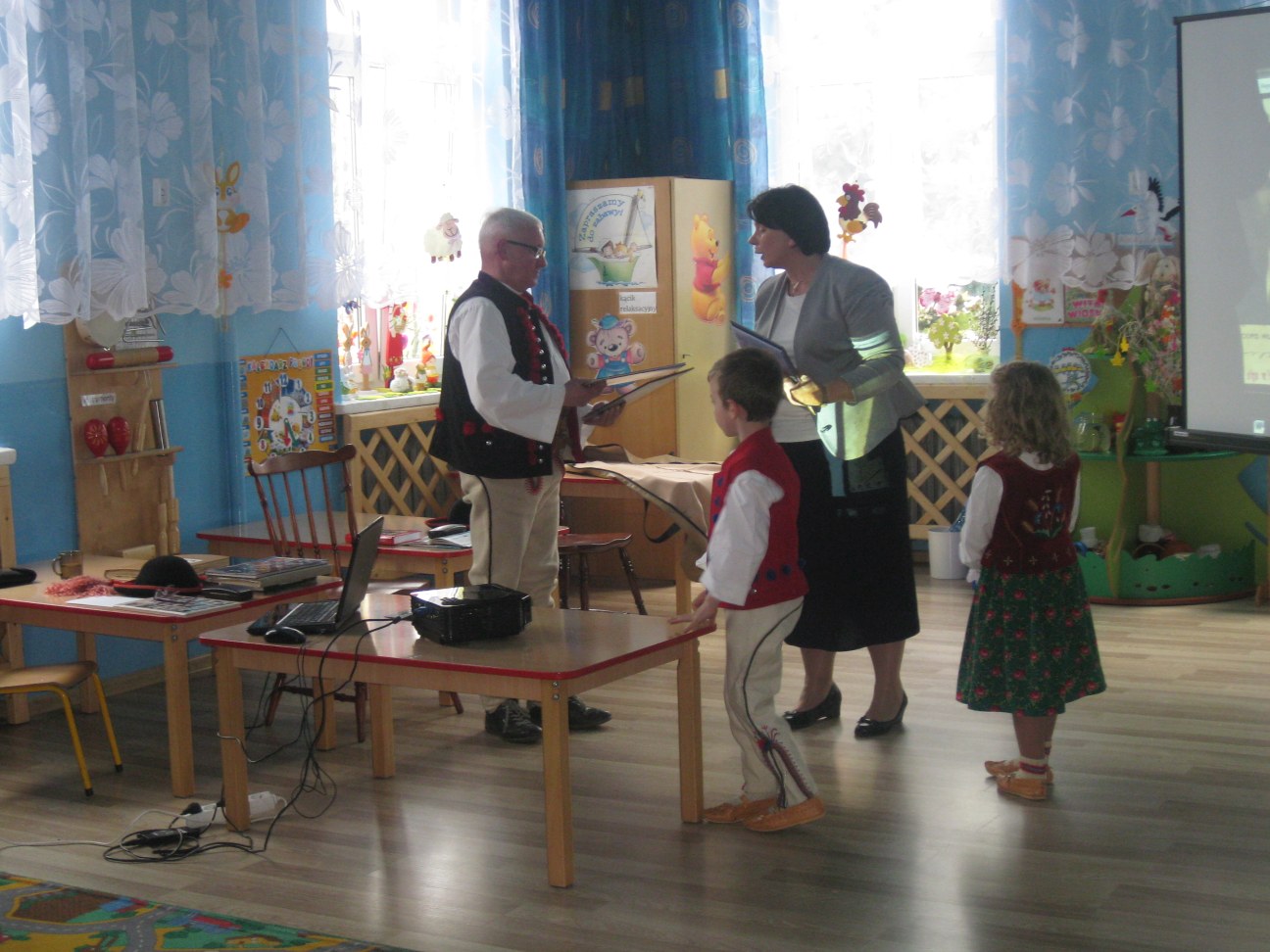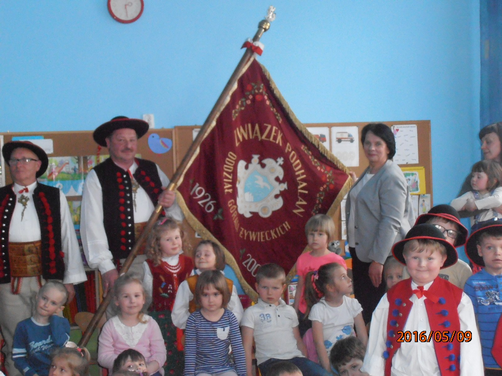 Pan Stanisław Lizak zaprezentował dzieciom tradycyjne elementy stroju góralskiego oraz jeden z trzech sztandarów Oddziału Górali Żywieckich Związku Podhalan. Na zakończenie spotkania zostało wykonane wspólne pamiątkowe zdjęcie wszystkich uczestników spotkania. Dziękujemy Panom Władysławowi Motyce i Stanisławowi Lizakowi za spotkanie, które wzbogaciło realizację projektu "Przodków wiary, przodków gwary niechaj strzeże młody, stary"- Historia radziechowskiego rodu Pieronków. Dziękujemy za udział w spotkaniu Rodzicom naszych przedszkolaków, Pani Marcie Husar z GCKPT Radziechowy- Wieprz oraz Pani Agacie Chmielowskiej z Radia ESKA Beskidy. Niebawem zostanie wyemitowana audycja radiowa relacjonująca wydarzenie.