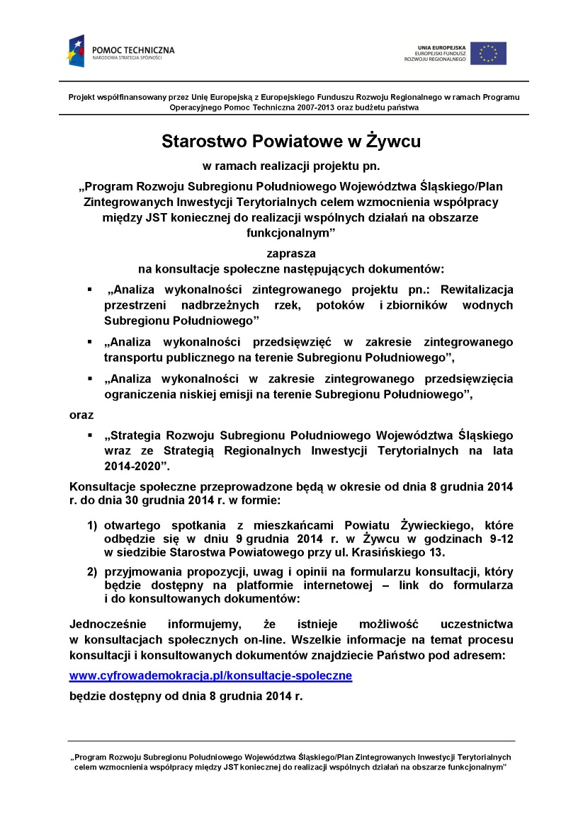 Starostwo Powiatowe w Żywcu w ramach realizacji projektu pn. „Program Rozwoju Subregionu Południowego Województwa Śląskiego/Plan Zintegrowanych Inwestycji Terytorialnych celem wzmocnienia współpracy między JST koniecznej do realizacji wspólnych działań na obszarze funkcjonalnym” zaprasza na konsultacje społeczne następujących dokumentów: